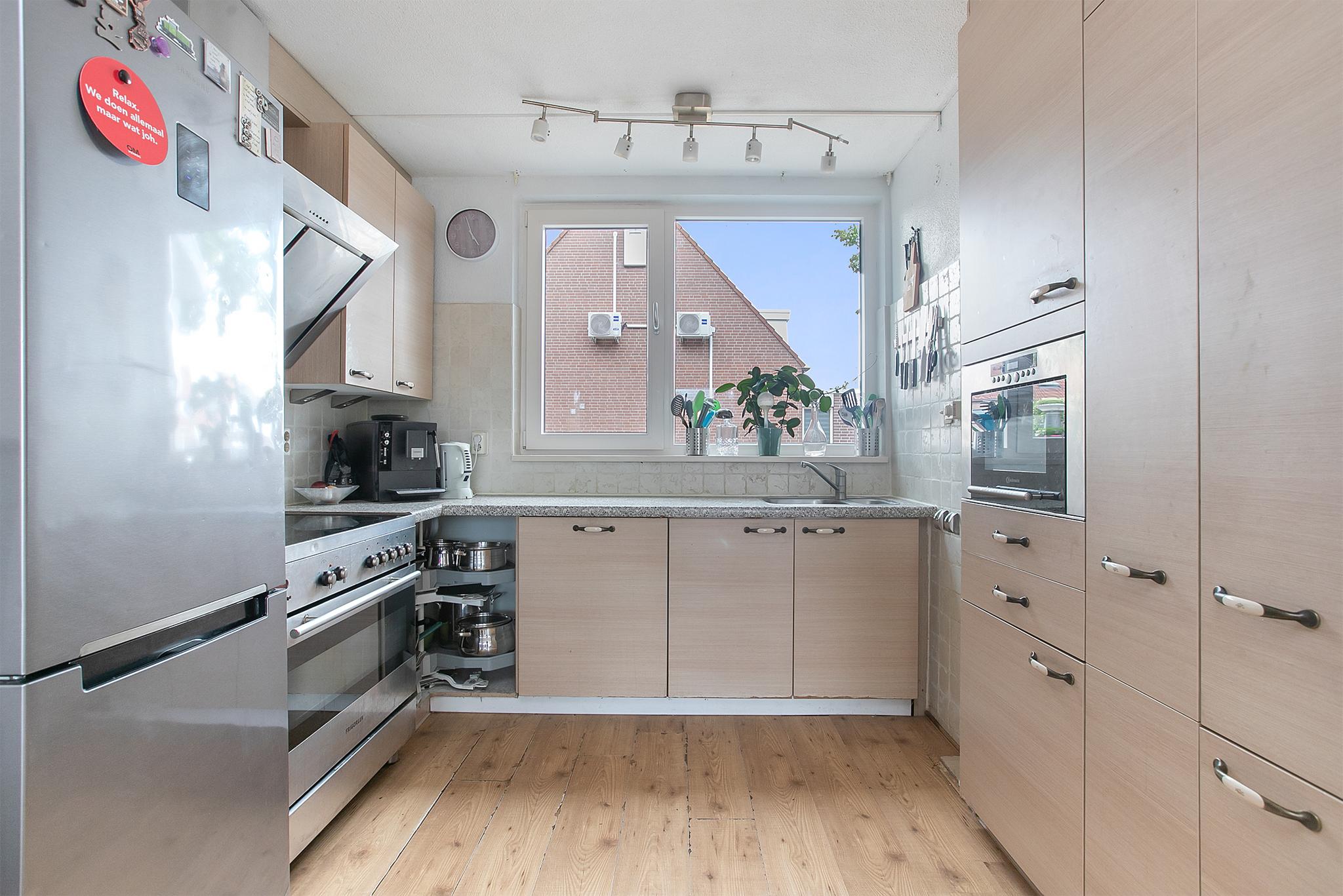 U komt de woning binnen in de hal met garderobe en trapopgang. De hal is uitgebouwd en is geheel vernieuwd in 2019. In de hal bevindt zich de meterkast met stadsverwarming en de glasvezelaansluiting en de toiletruimte met toilet en fonteintje. U betreedt de woonkamer welke is gelegen aan de achterzijde van de woning met zicht op de achtertuin. De woonkamer heeft een trapkast voor extra bergruimte. Middels een grote schuifpui (kunststof) bereikt u de achtertuin. Aan de voorzijde van de woning bevindt zich de open keuken welke bestaat uit een hoekopstelling met diverse inbouwapparatuur waaronder: een grote inductie kookplaat ( 4 normale zones en 1 flexzone) met een schuine afzuigkap met verlichting, een oven, een magnetron met stoomfunctie, een vaatwasser (circa 5 jaar oud) en veel bergruimte in de kasten, apothekerskast en draaicarrousel. De kunststof ramen hebben een speciale inbraakveilige ventilatiestand. De vloeren zijn voorzien van laminaat.