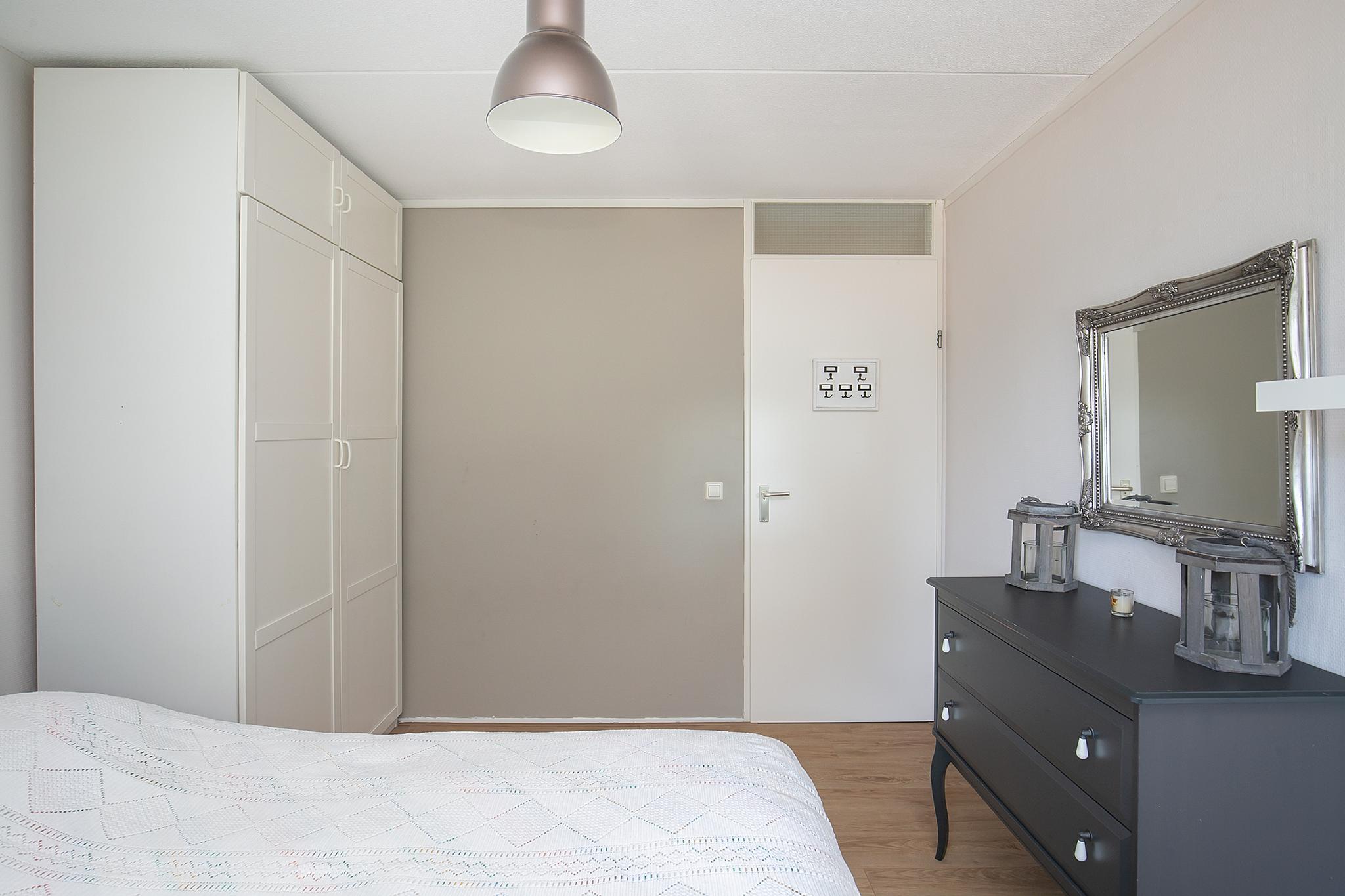 De slaapkamer is te bereiken vanuit de overloop en heeft veel lichtinval door de ramen aan beide zijden. Er is een keukenblok met een koelkast, kookplaat en een koud water kraan. Op de verdieping zijn ook leidingen aanwezig voor een 2e badkamer.