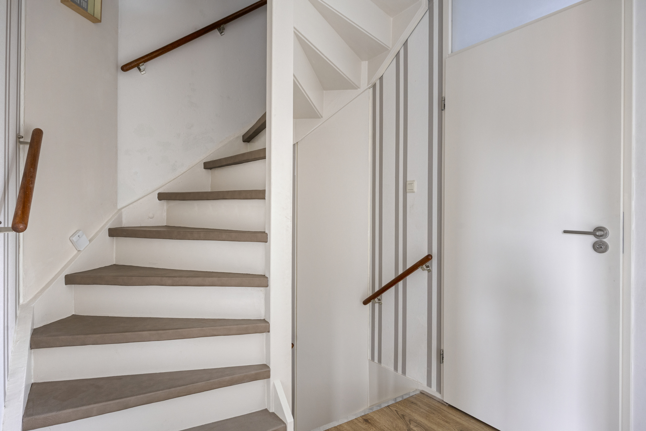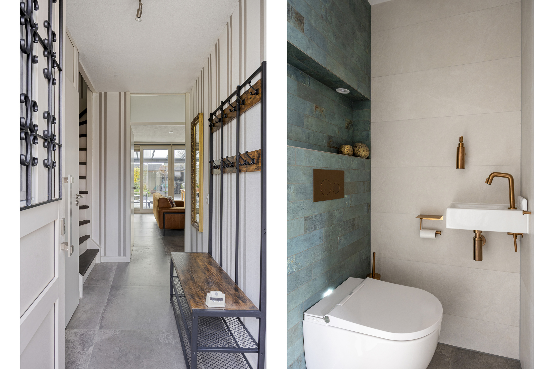 Bij binnenkomst valt direct de verzorgde afwerking van de woning op. In de hal vind je ruimte voor jassen en schoenen, de meterkast (2020, met glasvezelaansluiting), het nieuwe toilet (2025) met een Japans toilet, fonteintje en stijlvolle koperen accessoires, en de trapopgang naar de eerste verdieping.