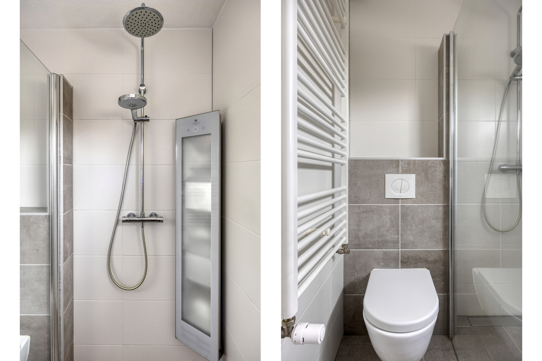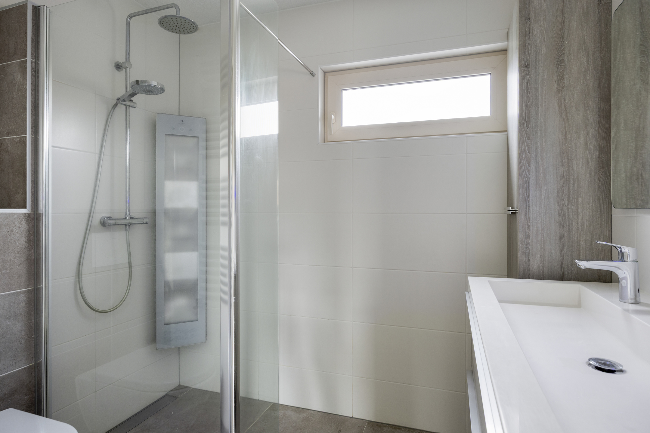 Aan de achterzijde bevindt zich de moderne badkamer (2015), volledig betegeld tot het plafond in een grijs-witte kleurstelling. De badkamer is uitgerust met een inloopdouche met glazen wand, hand- én regendouche, sunshower, tweede toilet, designradiator en een wastafelmeubel met dubbele kraan.