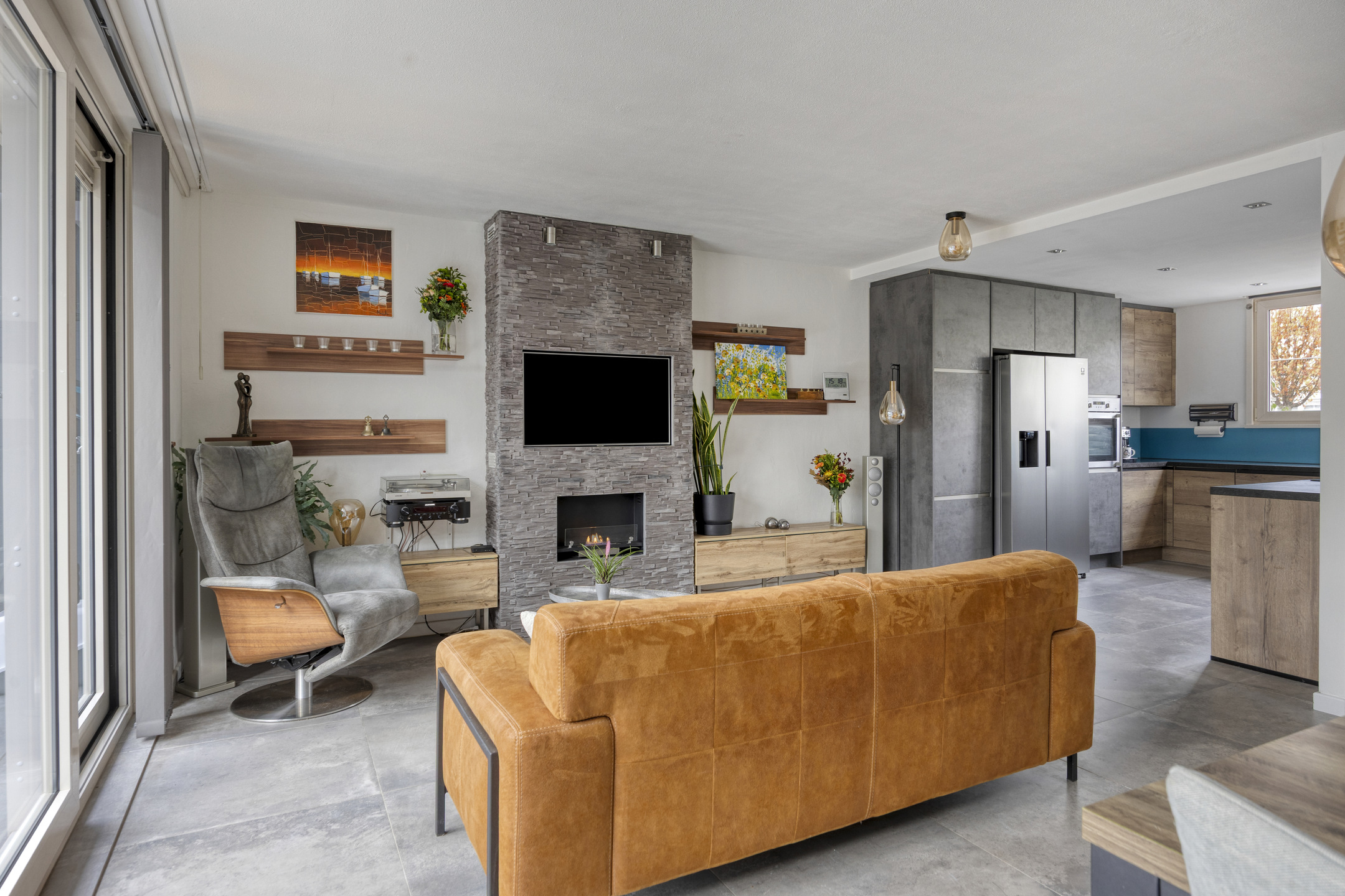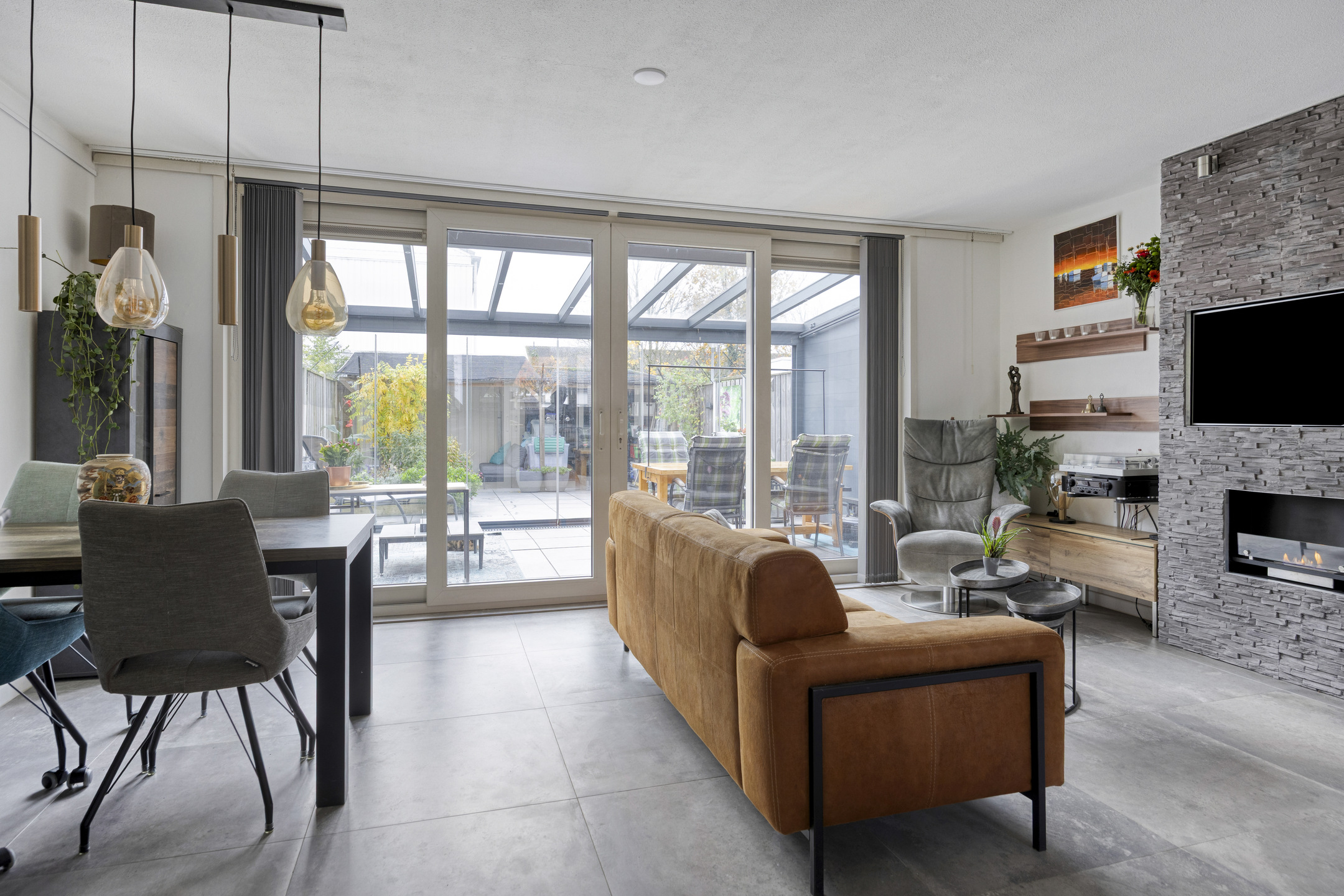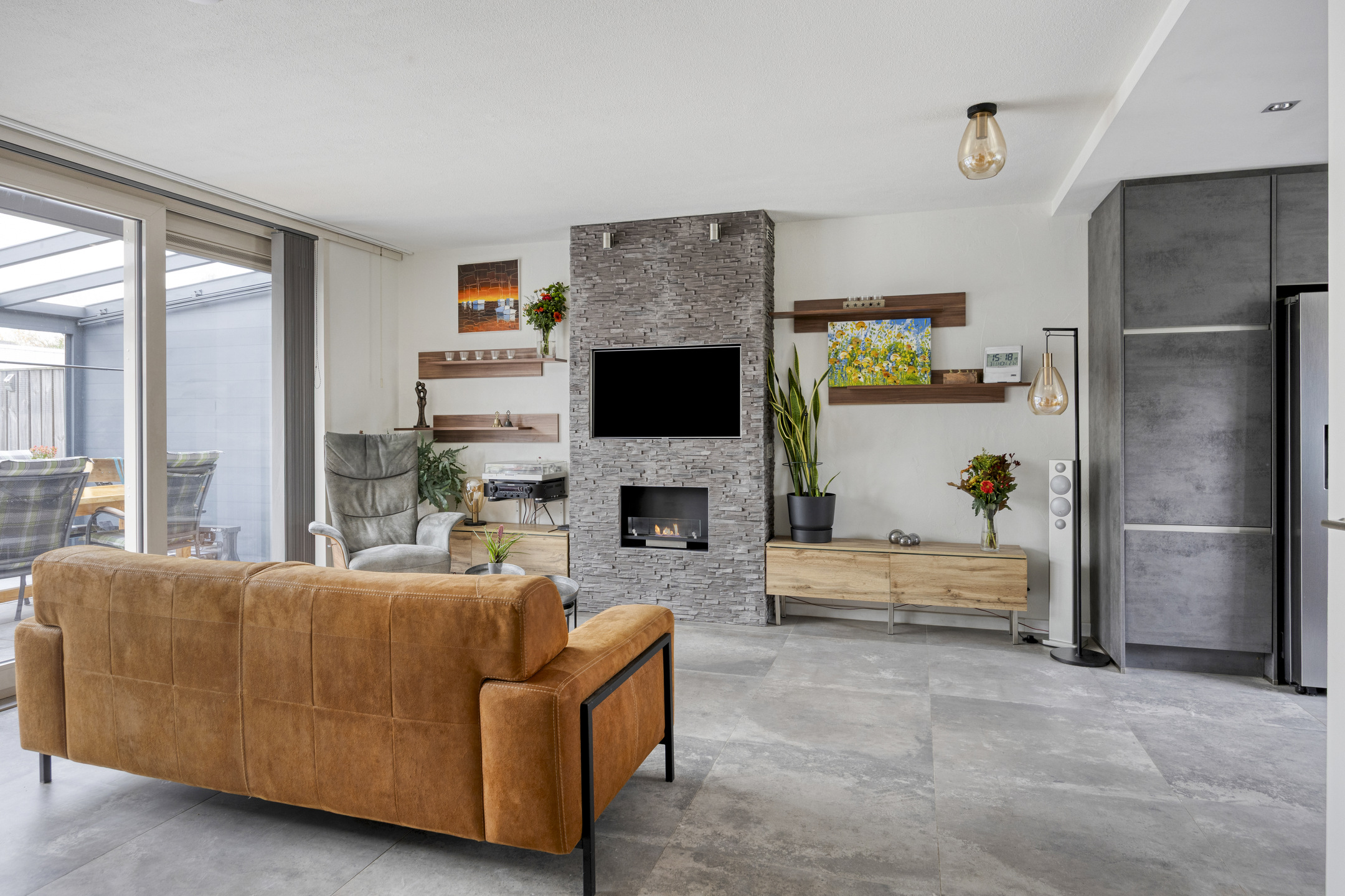 Via de tussendeur kom je in de ruime en lichte woonkamer. De woonkamer is voorzien van een antracietkleurige tegelvloer met vloerverwarming (2015), een luxe cinewall met sfeervolle gelhaard en grote kunststof schuifdeuren met HR++ beglazing naar de serre. De afwerking is modern, strak en met oog voor detail.