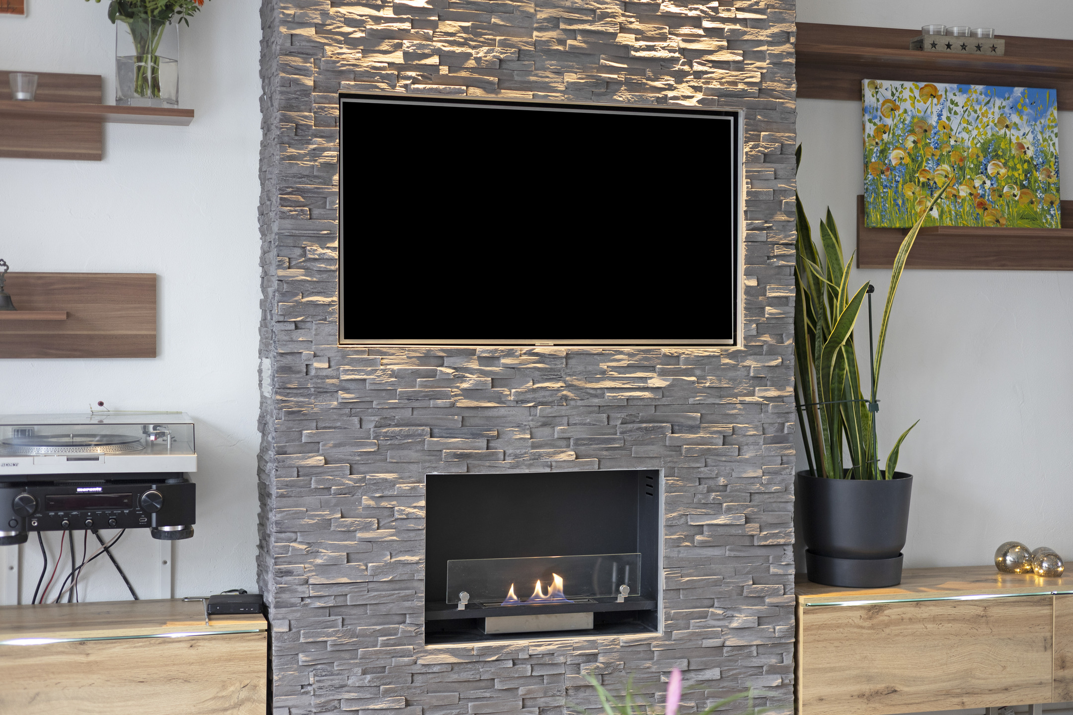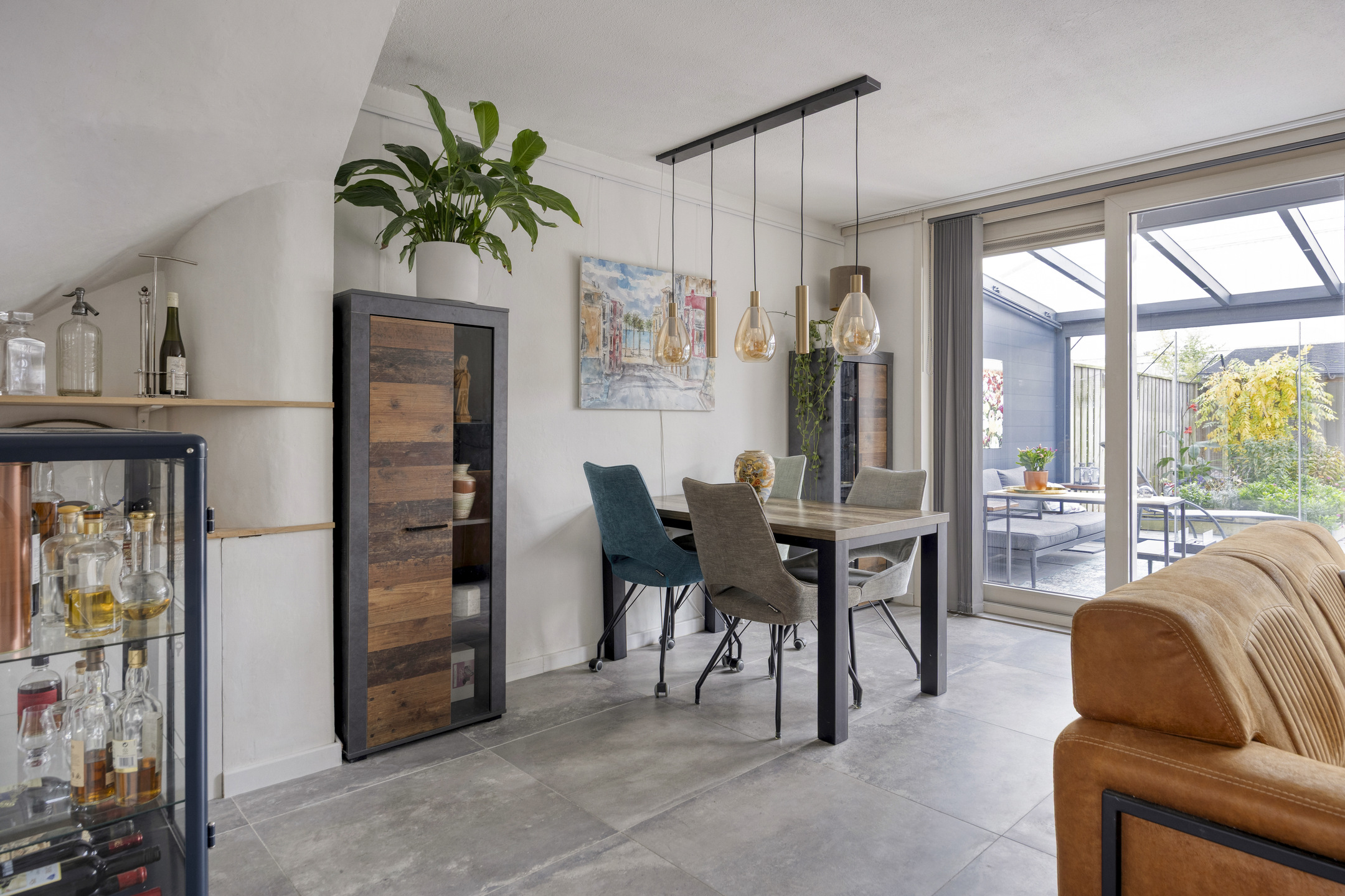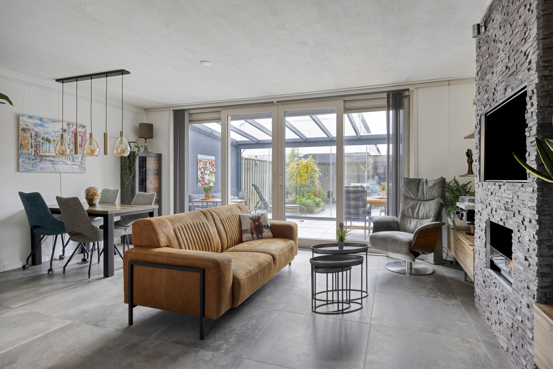 Via de tussendeur kom je in de ruime en lichte woonkamer. De woonkamer is voorzien van een antracietkleurige tegelvloer met vloerverwarming (2015), een luxe cinewall met sfeervolle gelhaard en grote kunststof schuifdeuren met HR++ beglazing naar de serre. De afwerking is modern, strak en met oog voor detail.