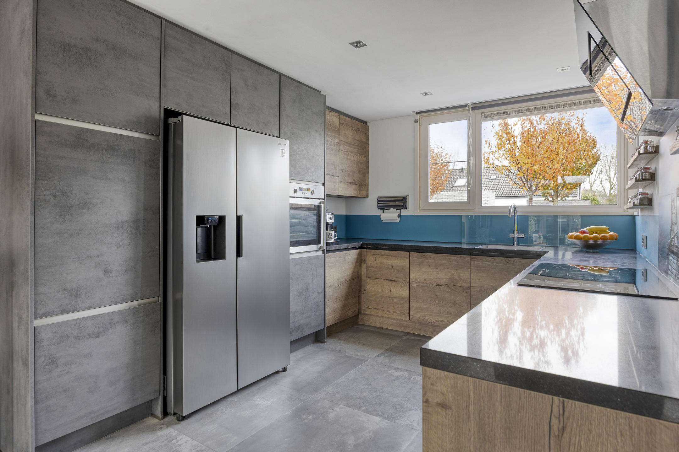 Aan de voorzijde bevindt zich de moderne keuken (2020) met een composiet aanrechtblad en diverse inbouwapparatuur, waaronder een inductiekookplaat met 5 zones, afzuigkap (met afvoer naar buiten), vaatwasser en oven. Daarnaast is er ruimte voor een Amerikaanse koelkast (ter overname mogelijk). Het plafond is verlaagd en voorzien van inbouwspots, wat zorgt voor een luxe uitstraling — een heerlijke plek voor kookliefhebbers!