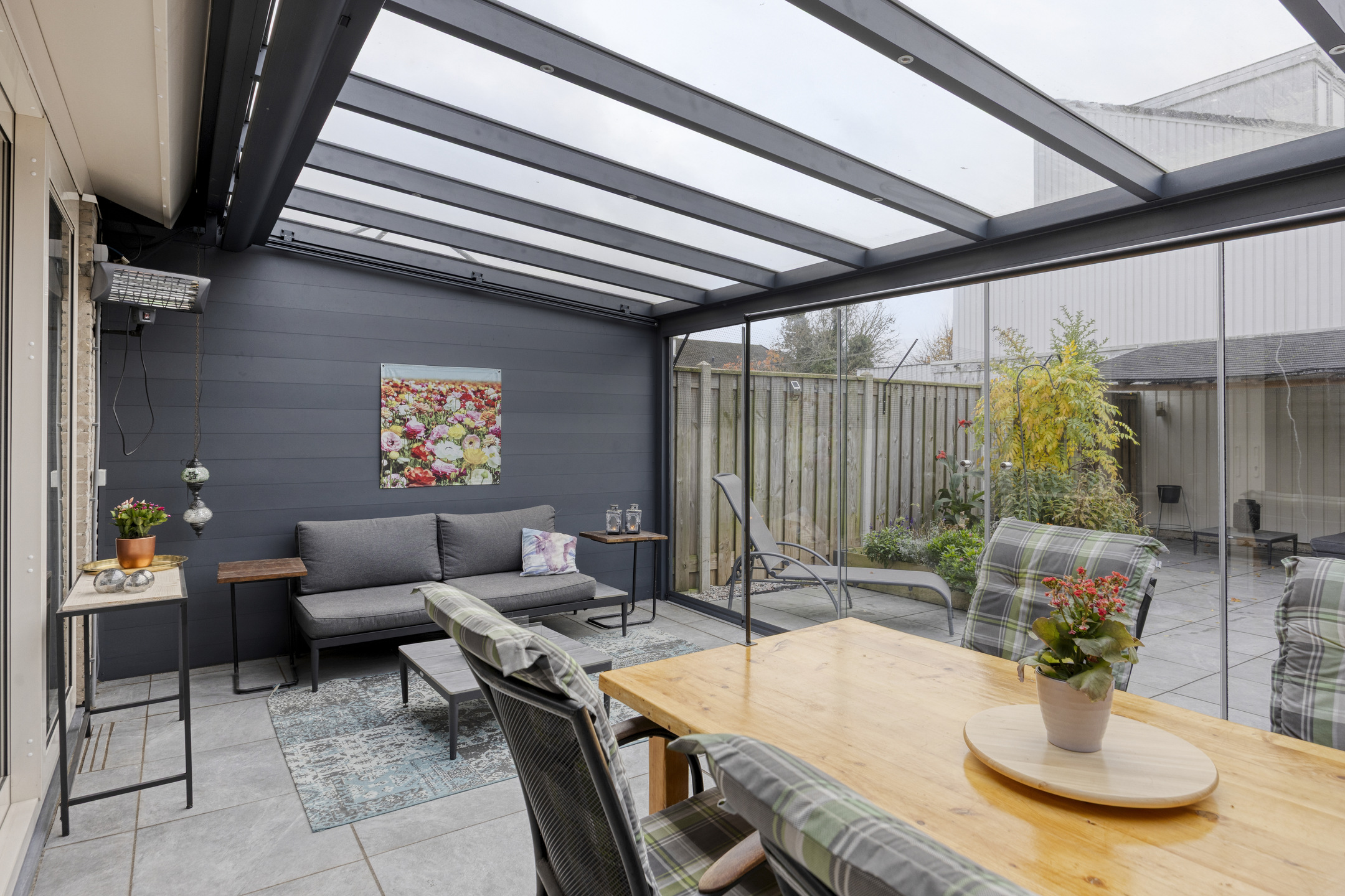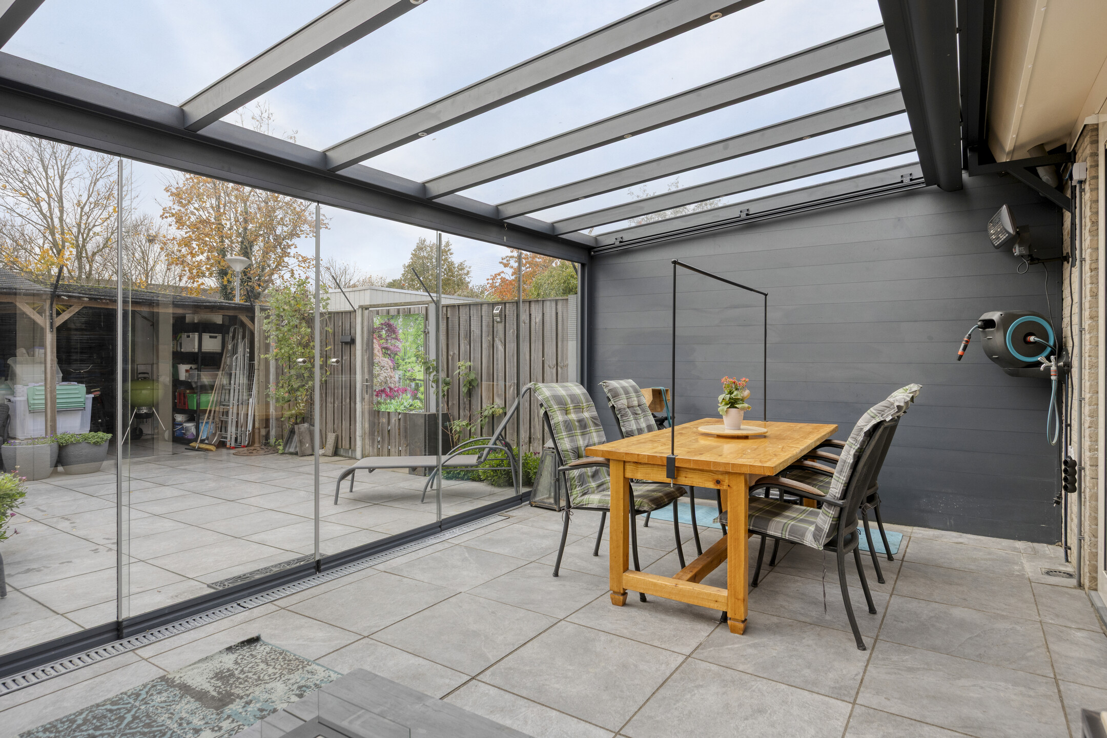 Via de woonkamer stap je de royale tuinkamer/serre (2021) binnen. Deze is volledig gefundeerd, voorzien van zonwering en glazen schuifwanden en vormt een prachtig verlengstuk van de woonkamer. Dankzij de goede isolatie is deze ruimte het hele jaar door bruikbaar — ideaal als eetkamer, relaxruimte of speelkamer.