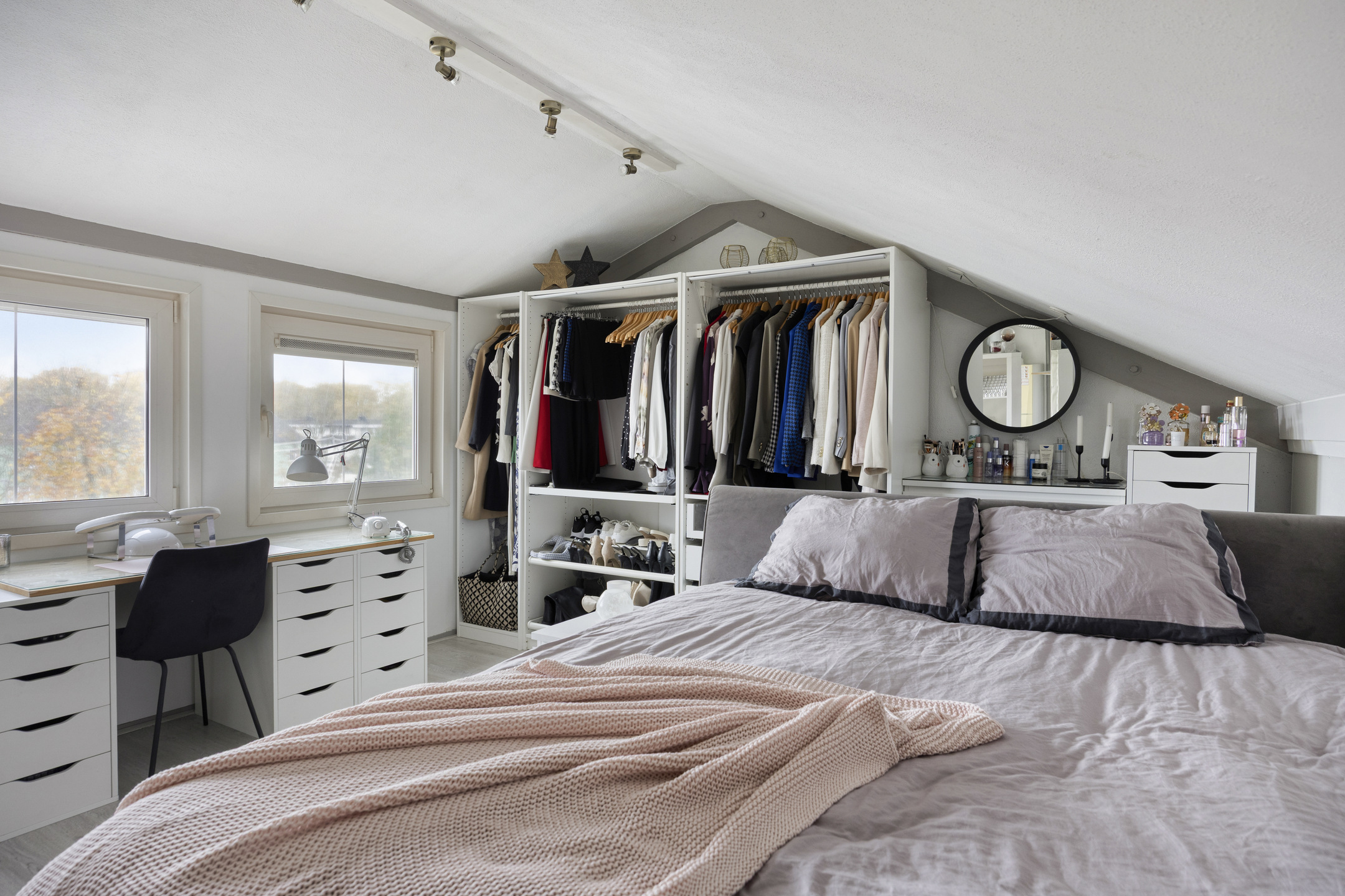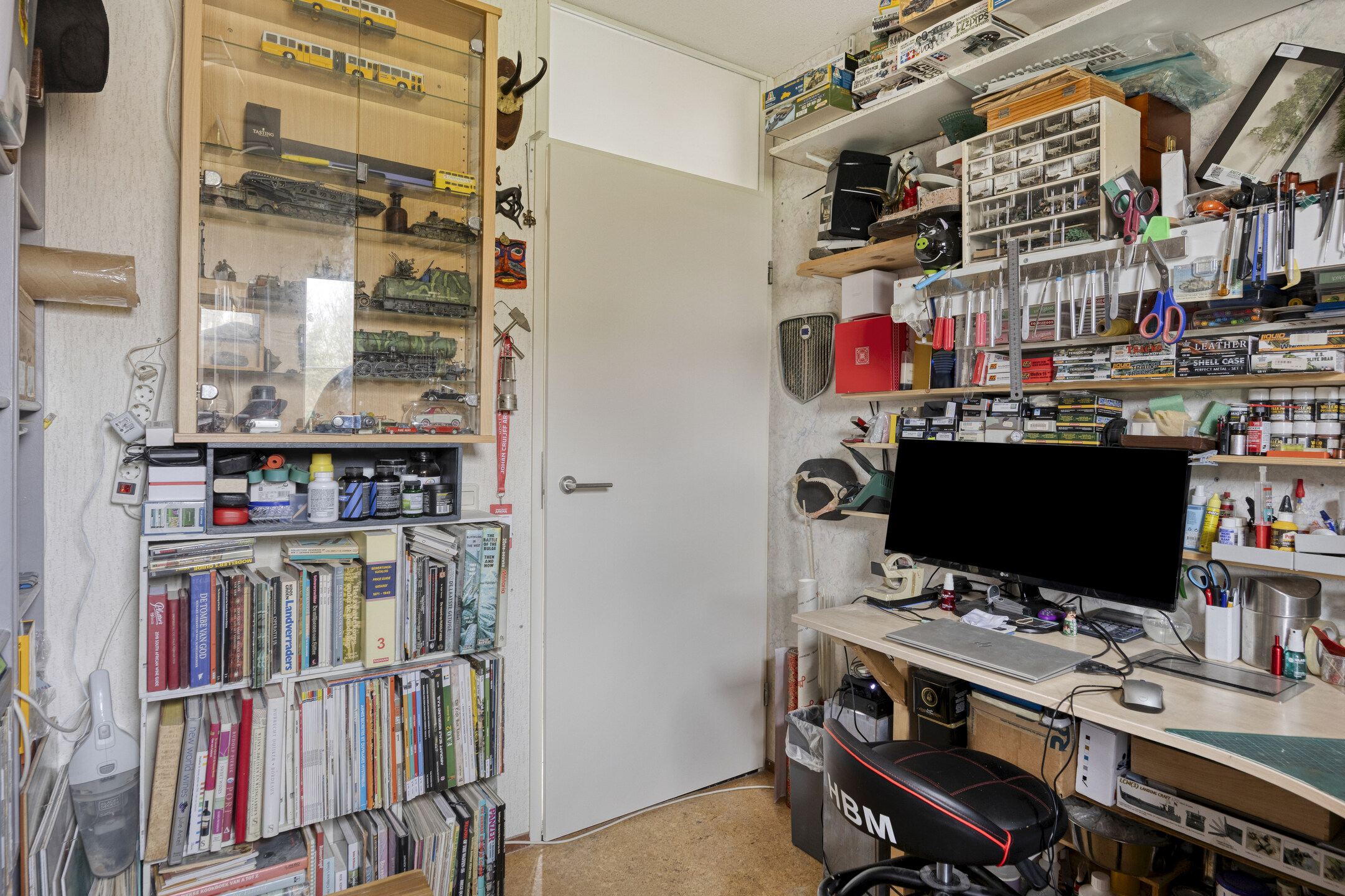 Aan de voorzijde zijn knieschotten met schuifdeuren geplaatst, waardoor extra bergruimte is gecreëerd. De kunststof ramen zijn voorzien van rolluiken, en de ruimte is uitstekend geschikt als slaapkamer, werkkamer of hobbyruimte.