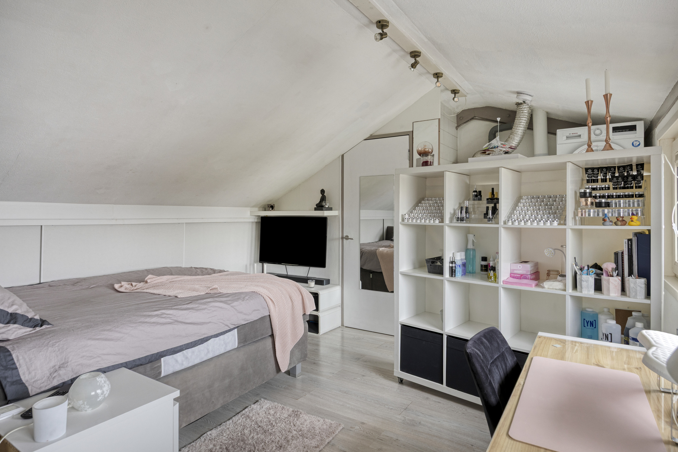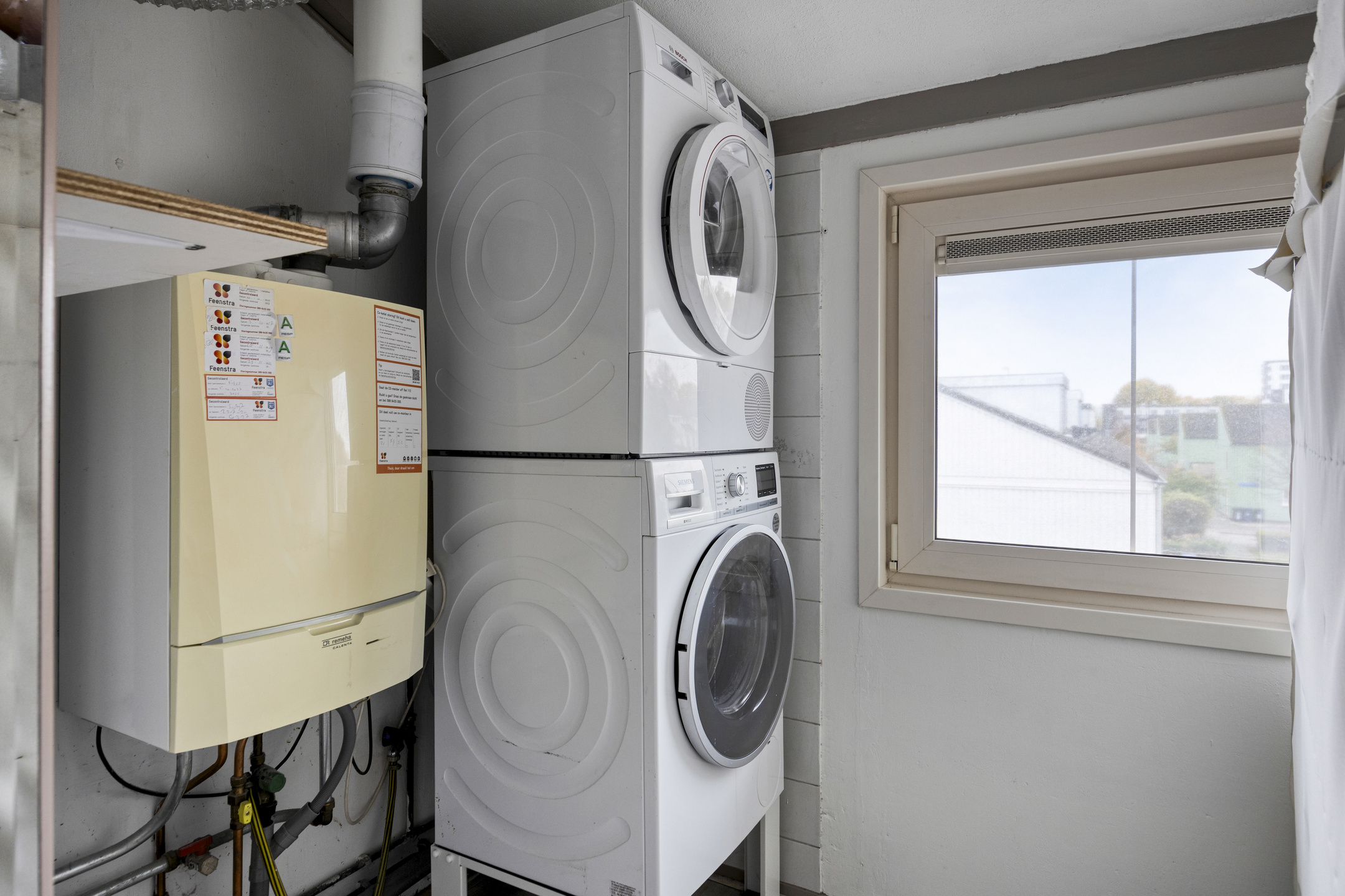 Via de vaste trap bereik je de zolderverdieping met een ruime vierde slaapkamer. Hier bevinden zich tevens de cv-installatie (onderhouden juli 2025), mechanische ventilatie (2017, onderhouden eind 2025) en de aansluitingen voor wasmachine en droger.