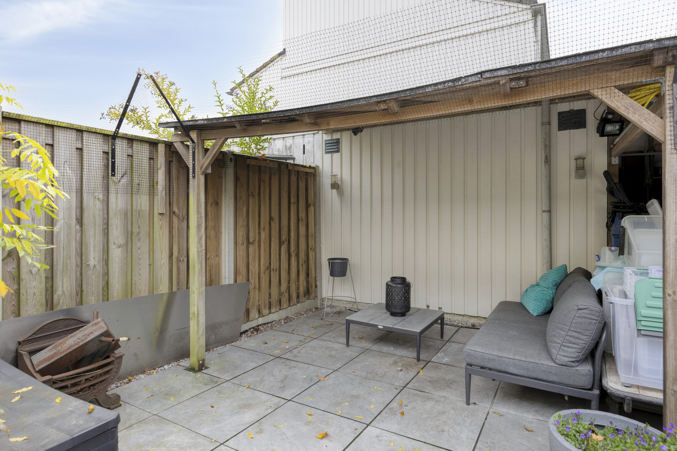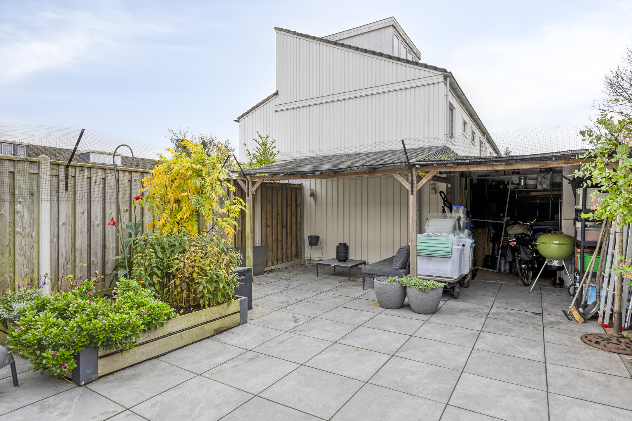 De tuin is volledig omheind met houten schuttingen en beschikt over een houten berging (schuurdak eind 2025 vernieuwd) met voldoende opbergruimte voor fietsen en tuingereedschap.