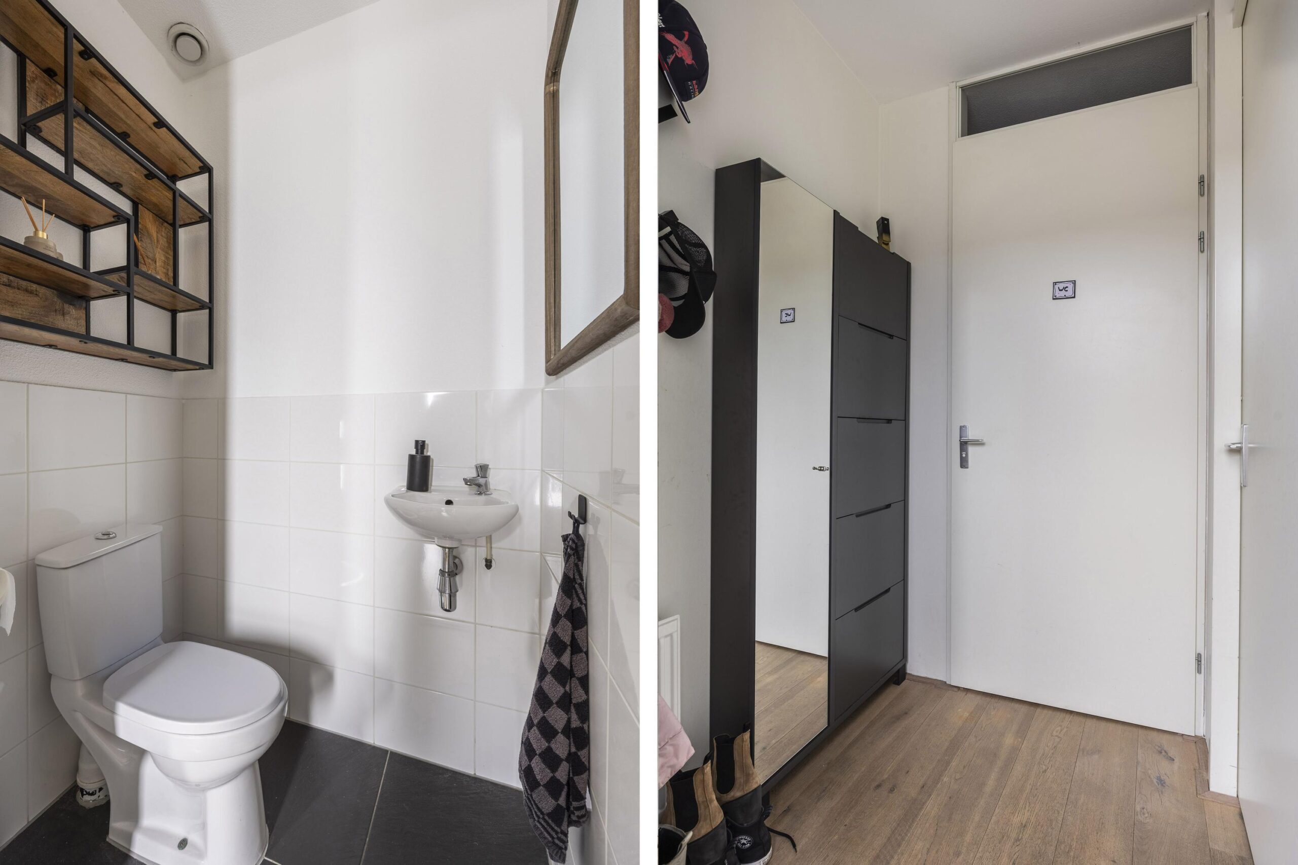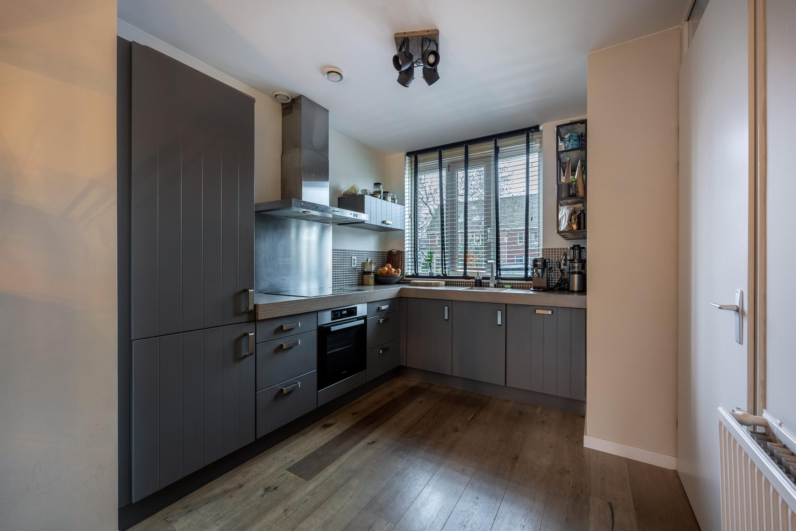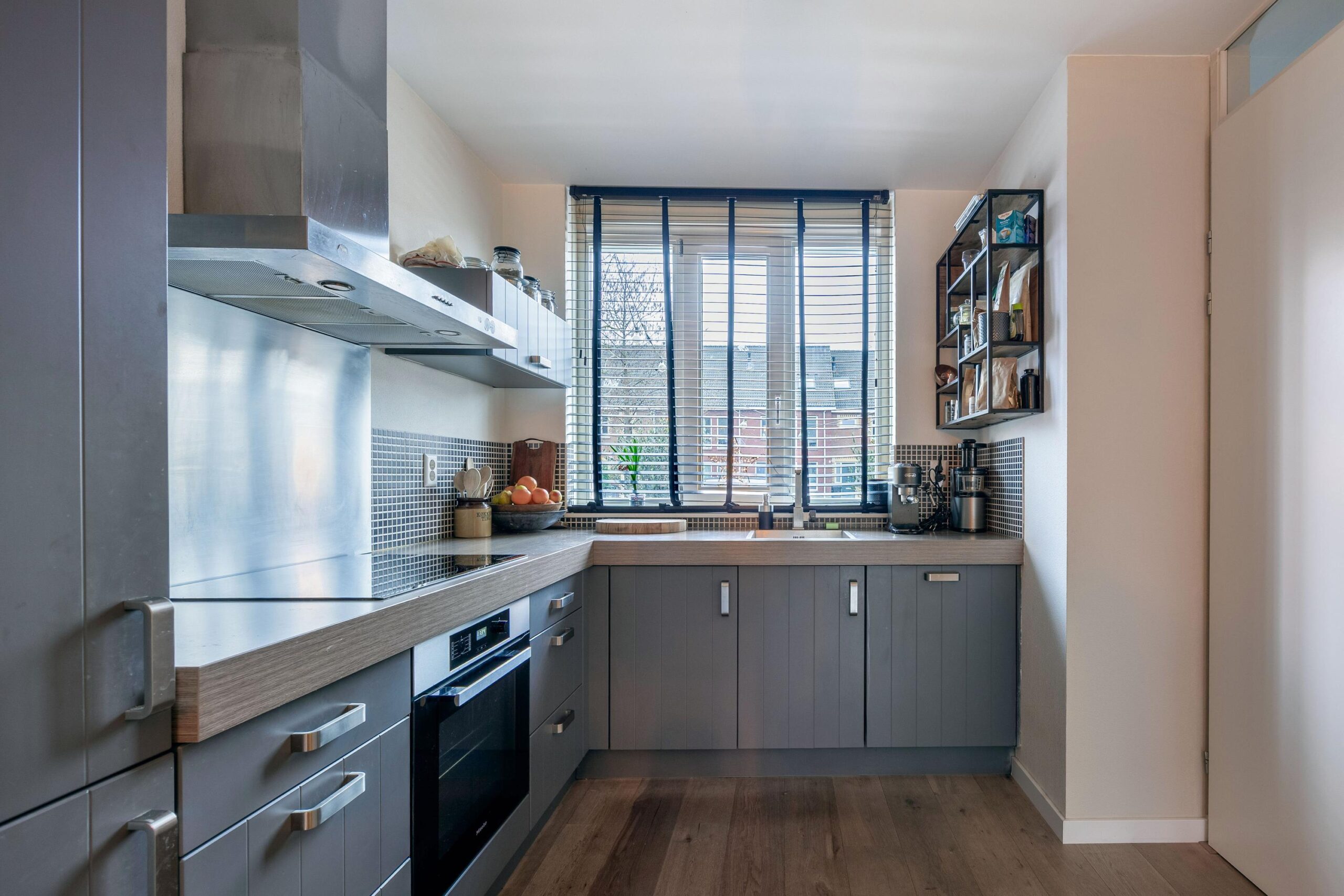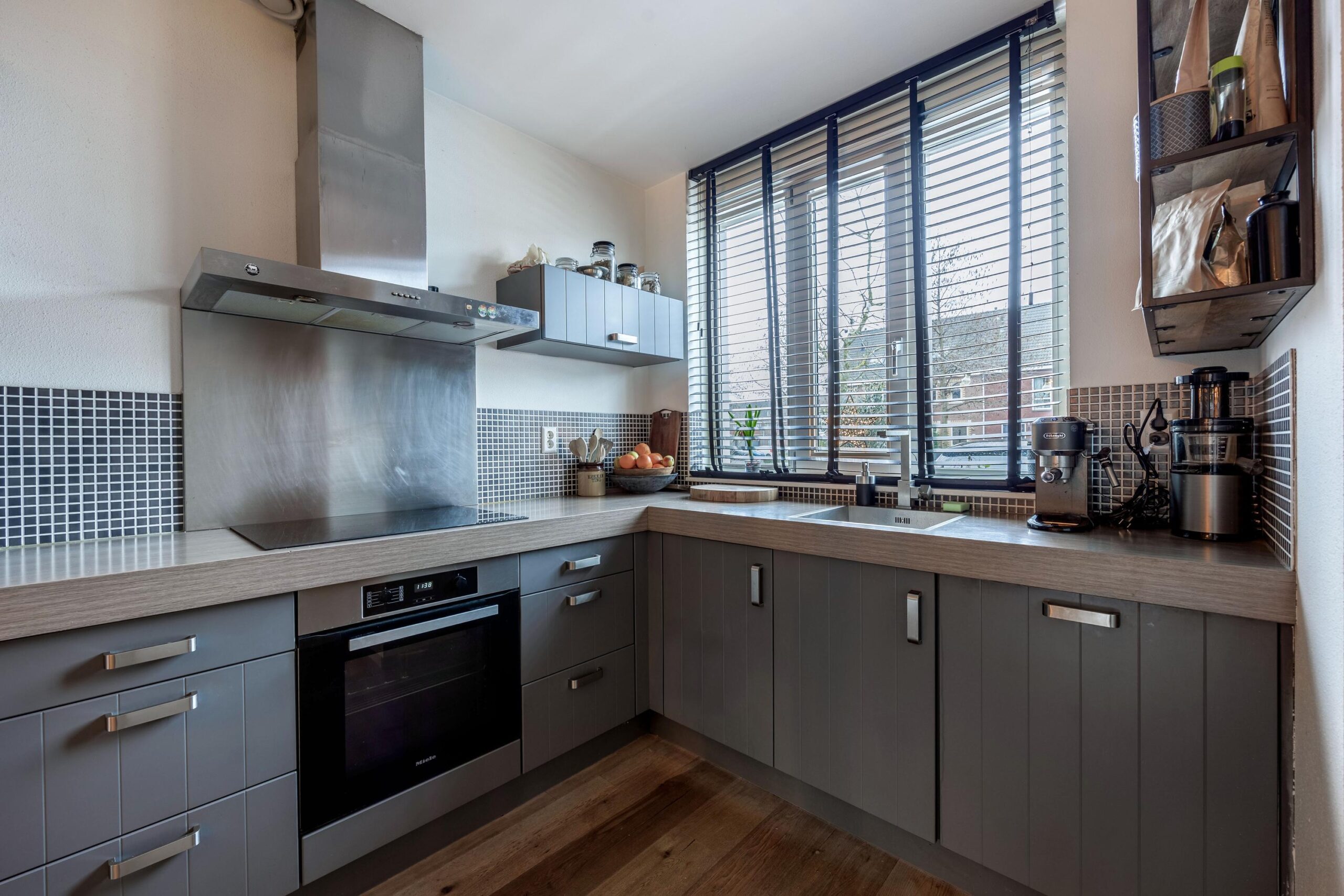 U betreedt de woning via de hal met de meterkast (voorzien van glasvezel) en een modern toilet met fonteintje. Vanuit de hal bereikt u de keuken aan de voorzijde van de woning. Deze hoekkeuken beschikt over veel kastruimte en diverse inbouwapparatuur, waaronder een nieuwe Bosch inductiekookplaat met wifi, een nieuwe Miele oven, een koel-/vriescombinatie, afzuigkap en een vaatwasser (ca. 4–5 jaar oud).