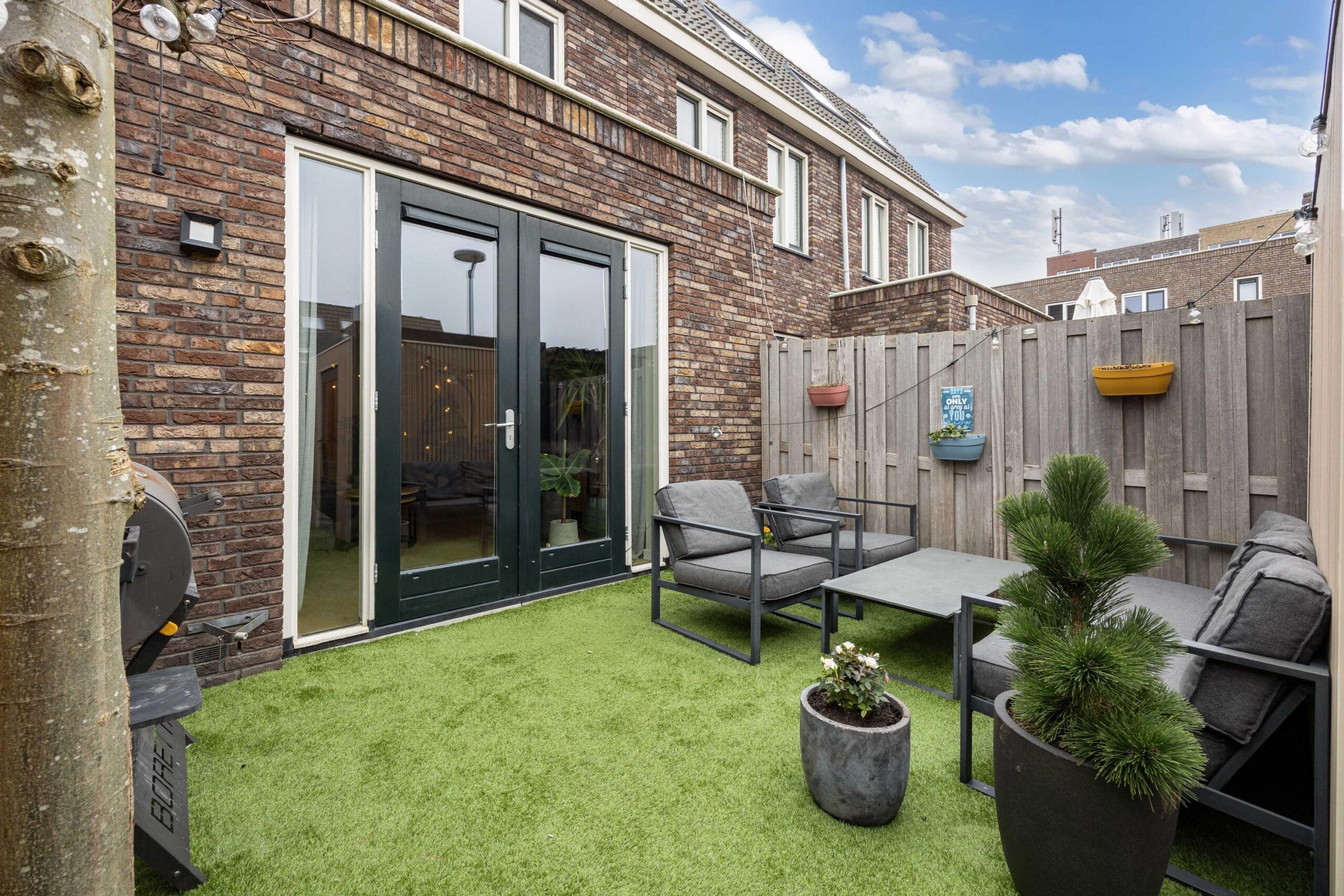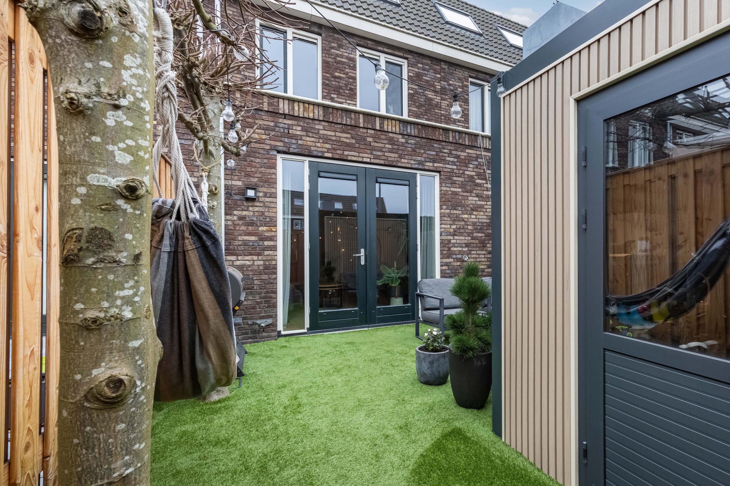 De zonnige achtertuin op het zuidoosten is verzorgd aangelegd met een nette kunstgrasmat en beschikt over een nieuwe aluminium berging (2023/2024) met elektra. De wanden en het dak is voorzien van isolatie. De tuin is omheind met houten schuttingen (gedeeltelijk vernieuwd) en bereikbaar via een achterom. Direct achter de tuin ligt het mandelige terrein met de bijbehorende eigen parkeerplaats. (Kosten per half jaar €119,49)