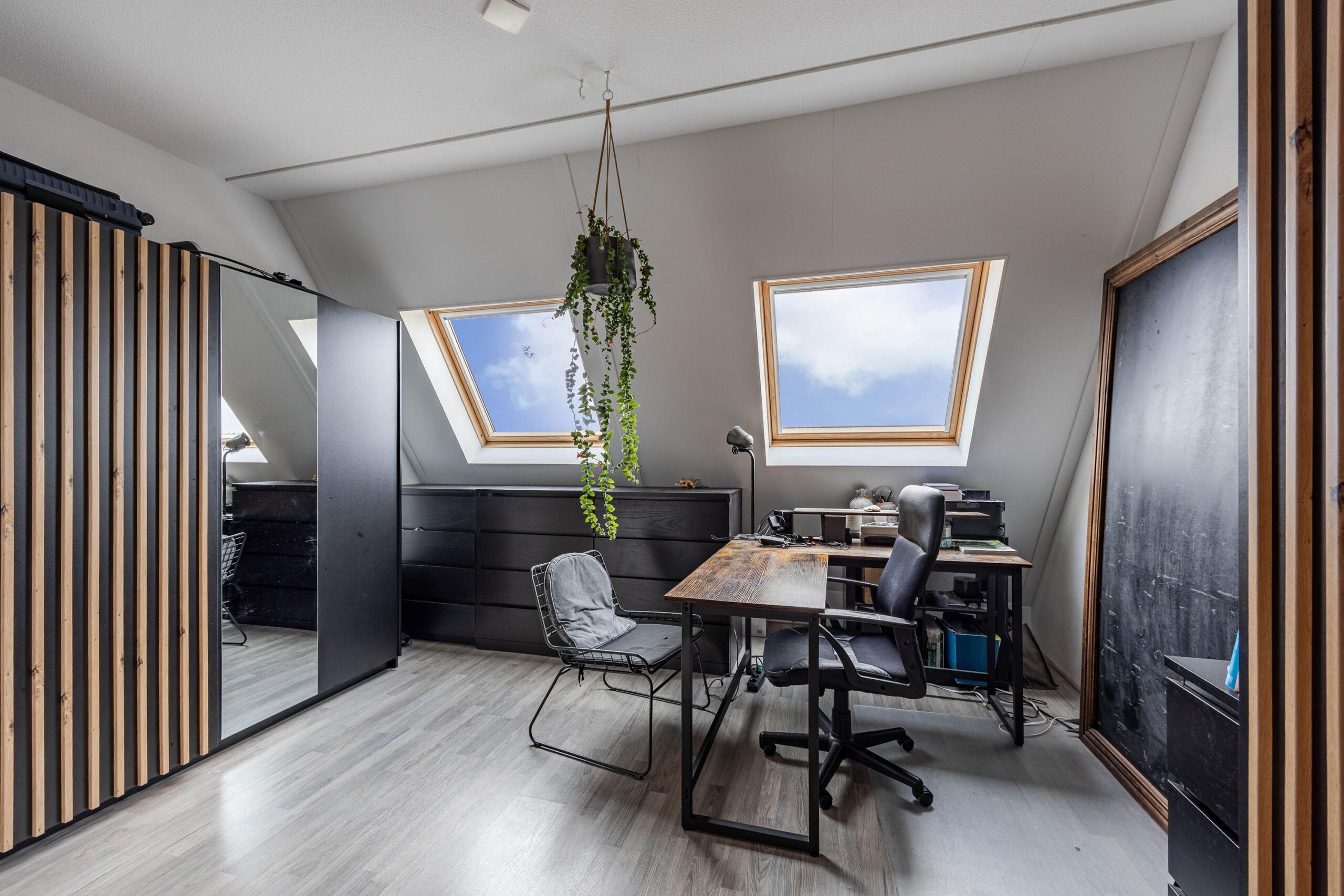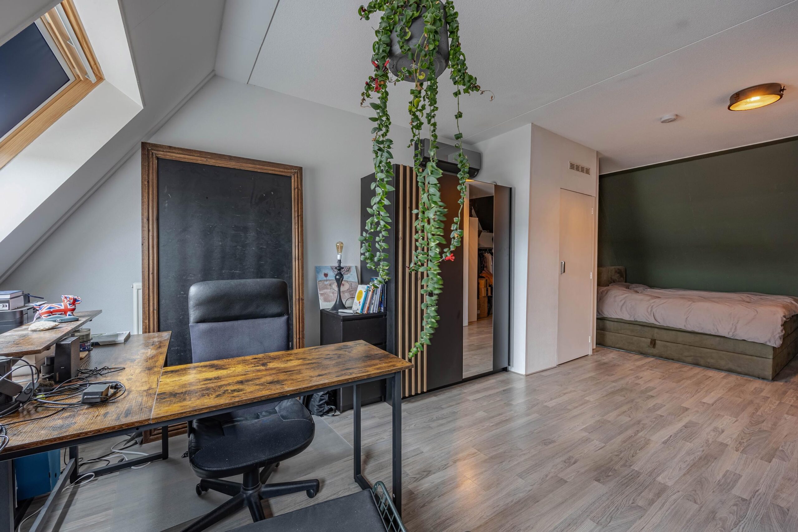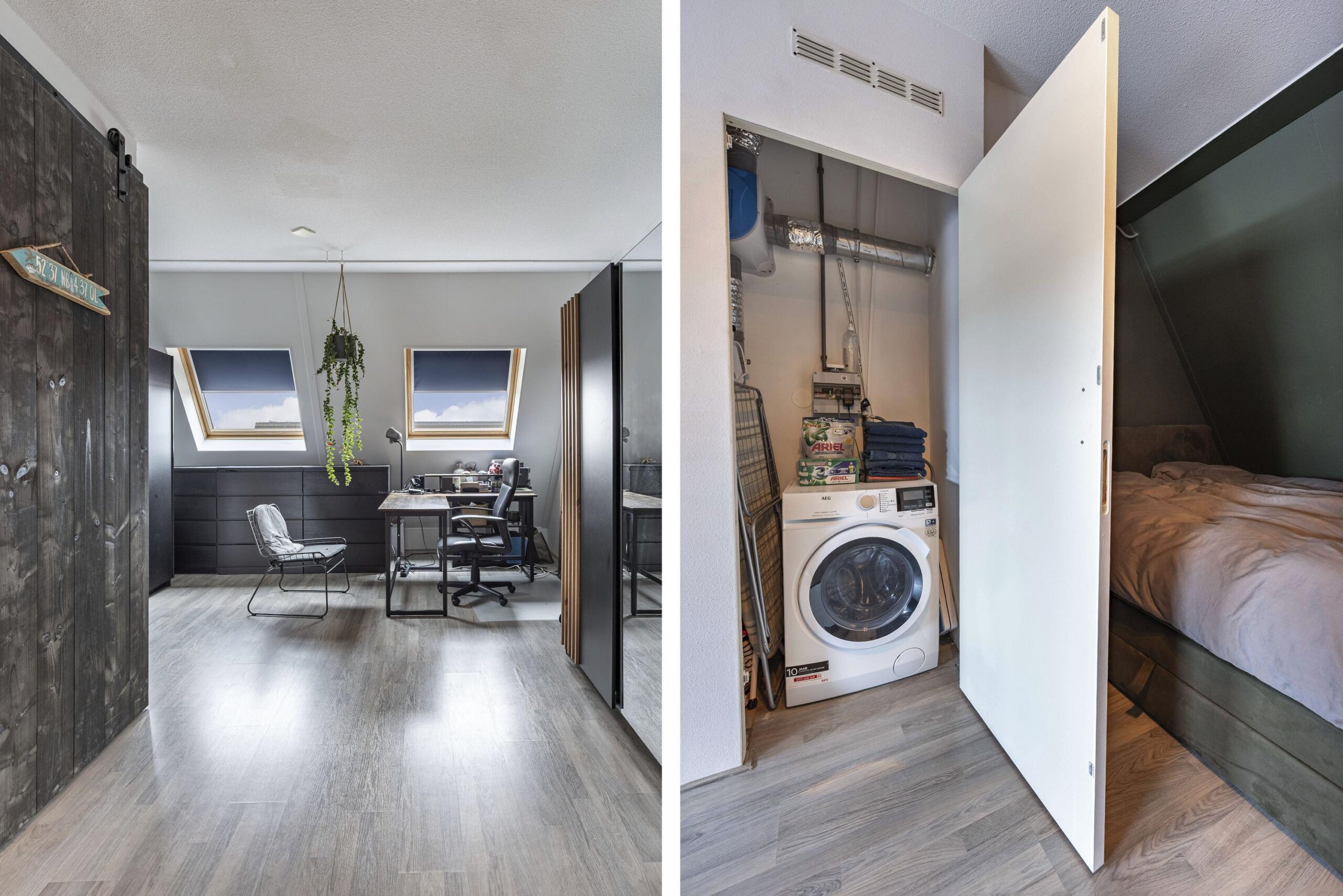 Via een vaste trap bereikt u de zolderverdieping, afgesloten met een schuifdeur. Dit is een open, multifunctionele ruimte met een grote werk- en/of slaapgelegenheid. Aan de achterzijde zorgen twee Velux dakramen voor veel daglicht. In het midden bevindt zich de praktische wasruimte met aansluitingen voor de wasmachine, de omvormer van de 14 zonnepanelen (2023) en de mechanische ventilatiebox. De aanwezige airconditioning maakt deze verdieping het hele jaar door comfortabel.