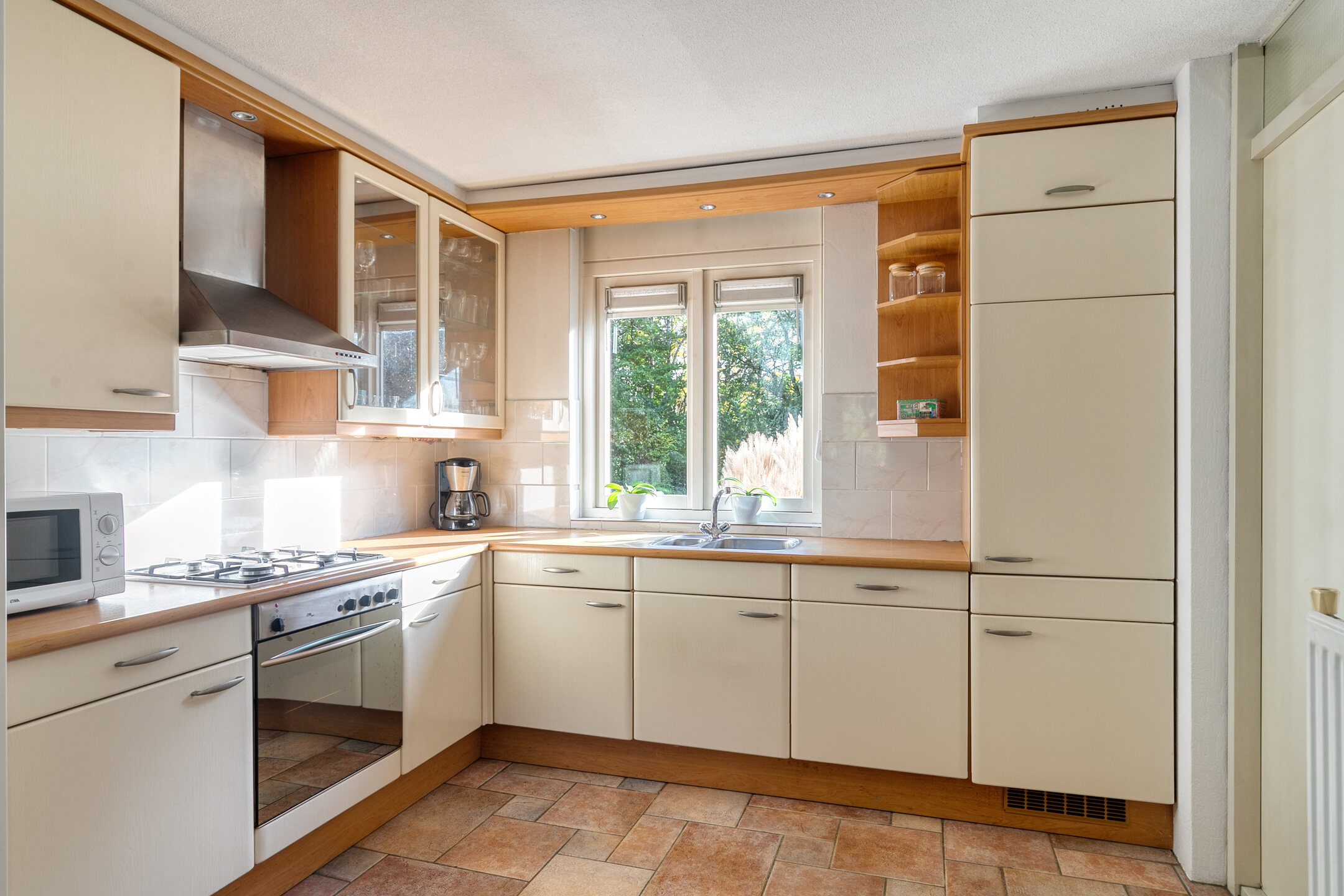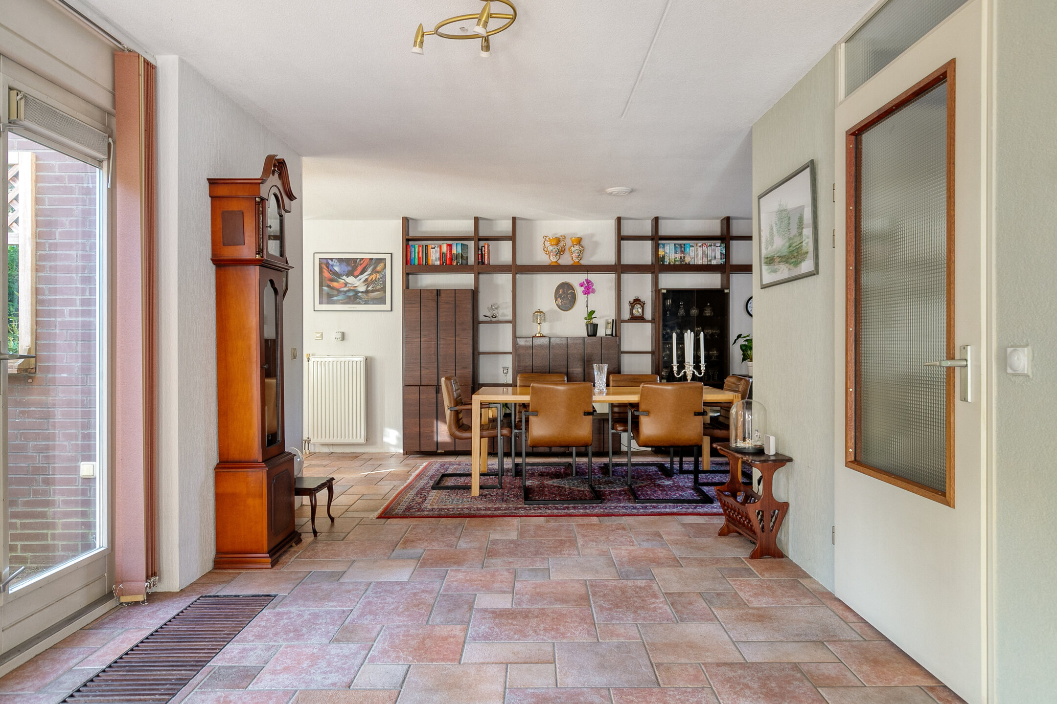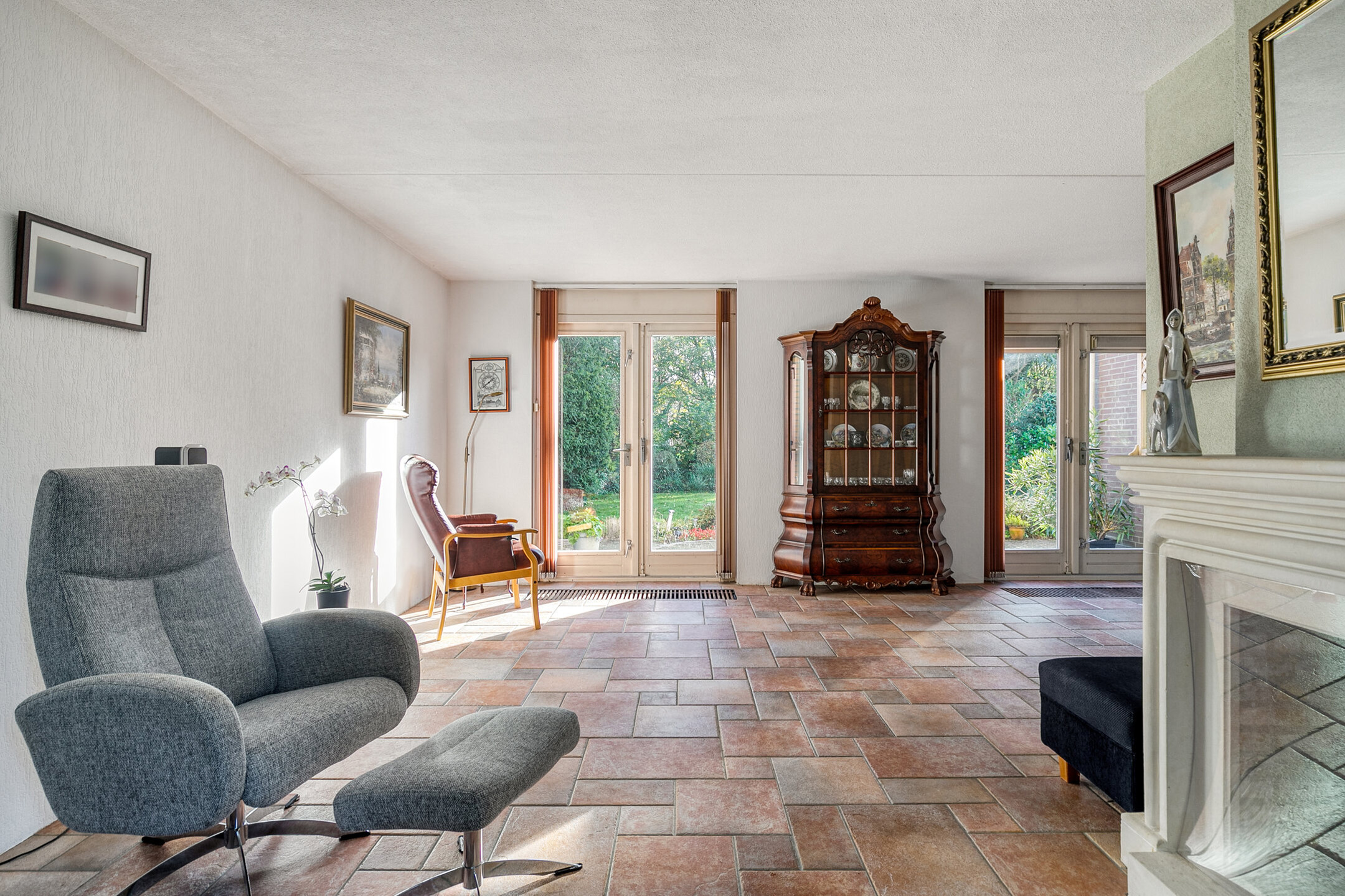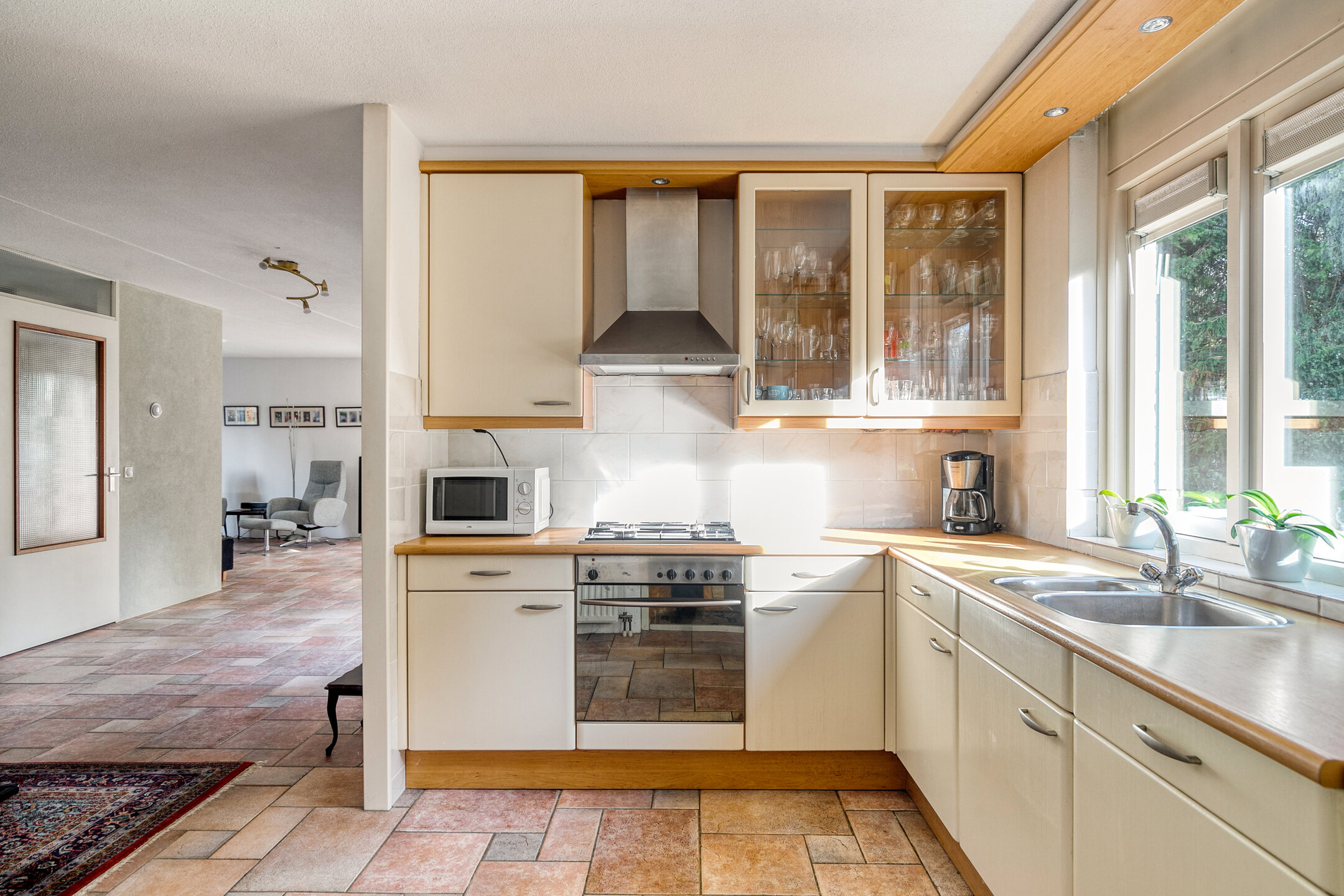 Stap binnen in de ruime hal met toilet, fonteintje en meterkast met glasvezel. Vanuit hier loopt u de lichte doorzonwoonkamer binnen: een fijne leefruimte met grote ramen, convectorput, sfeervolle gashaard en een praktisch ingedeelde zithoek aan de voorzijde. Aan de achterzijde openen dubbele deuren naar de tuin, waardoor binnen en buiten moeiteloos in elkaar overlopen.