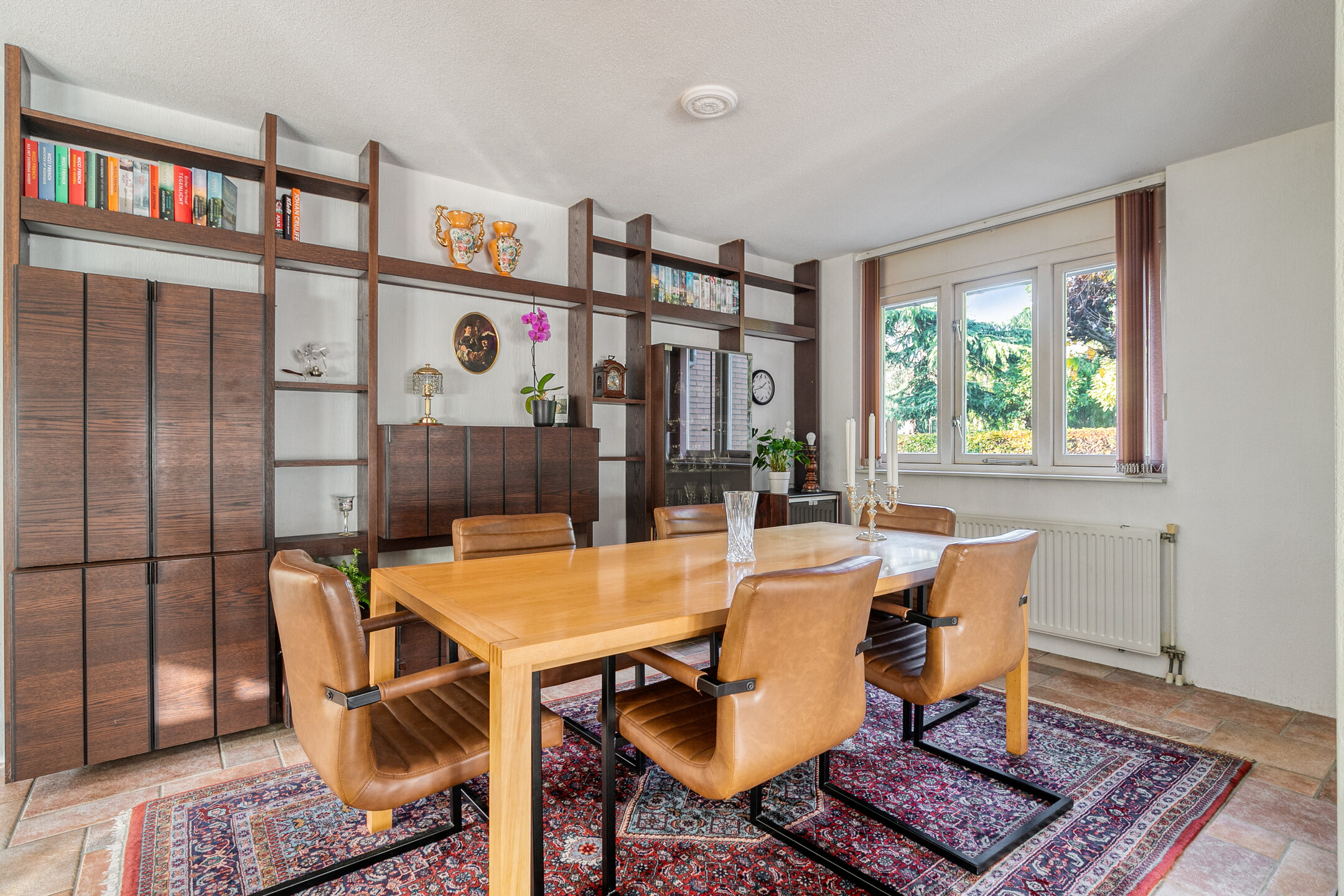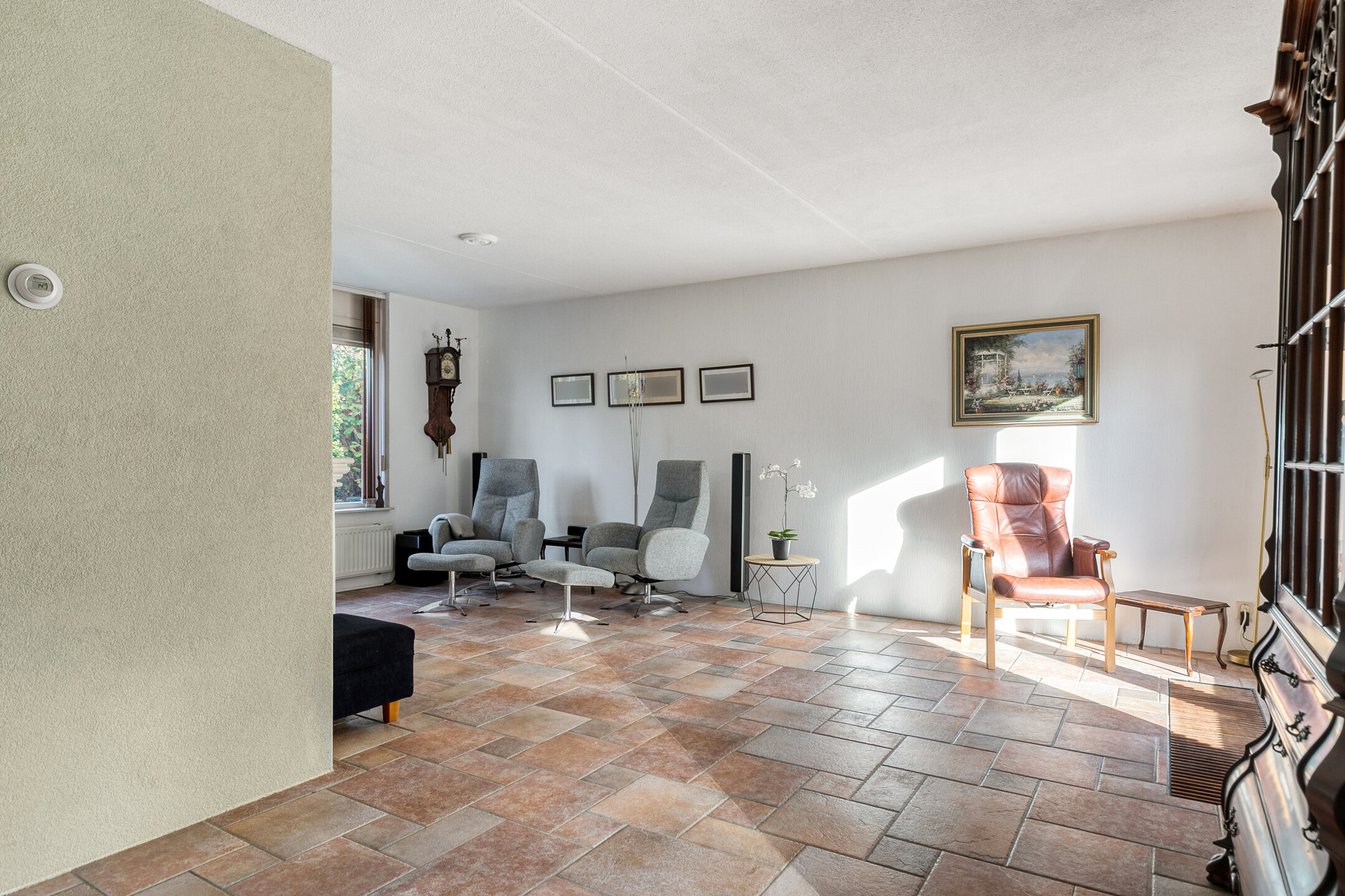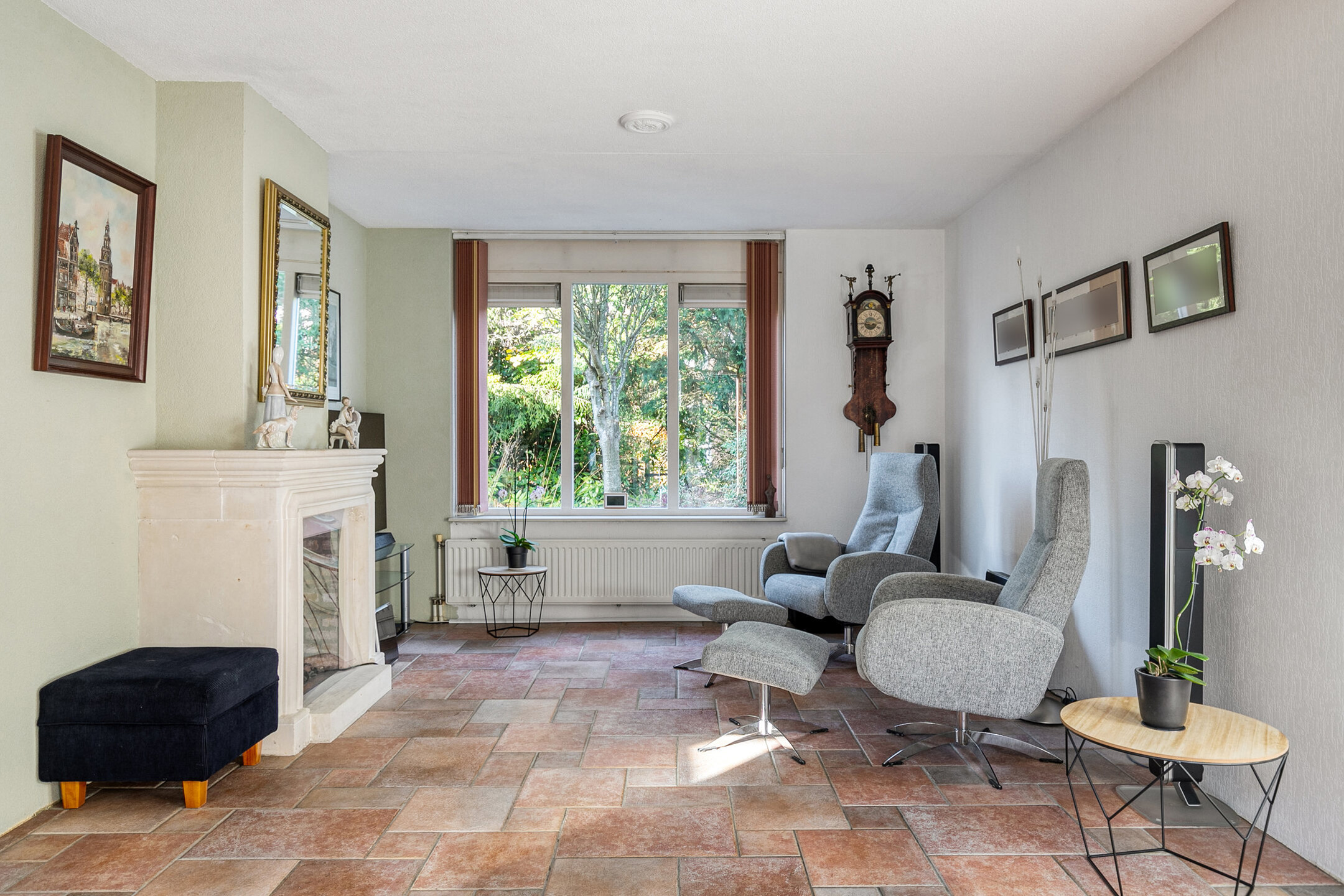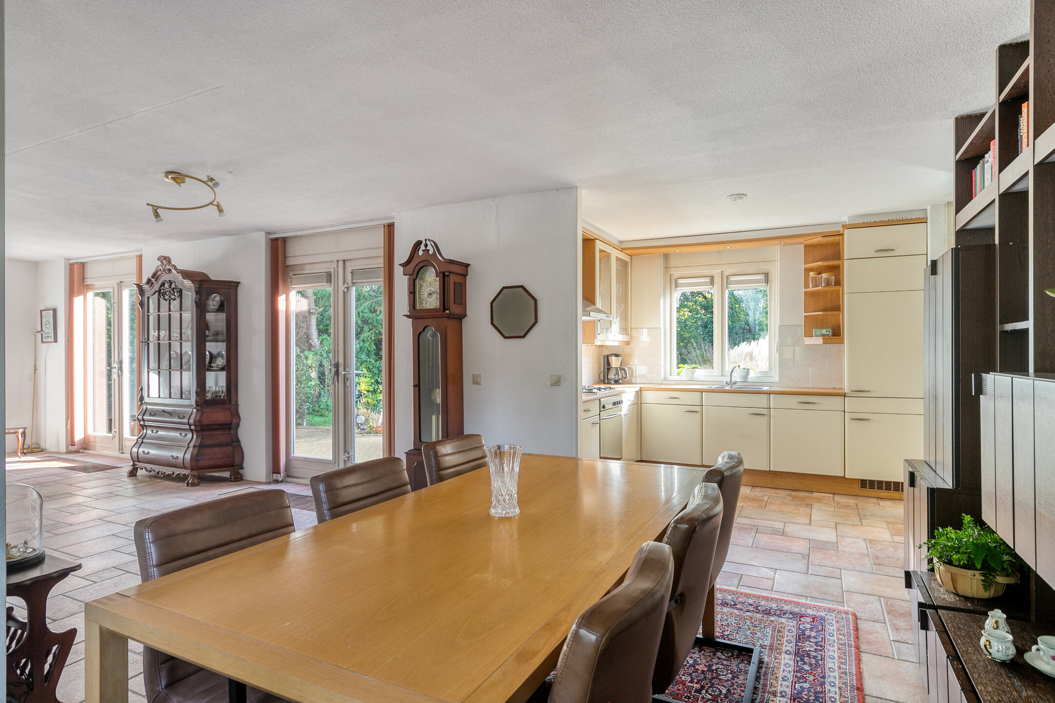 Stap binnen in de ruime hal met toilet, fonteintje en meterkast met glasvezel. Vanuit hier loopt u de lichte doorzonwoonkamer binnen: een fijne leefruimte met grote ramen, convectorput, sfeervolle gashaard en een praktisch ingedeelde zithoek aan de voorzijde. Aan de achterzijde openen dubbele deuren naar de tuin, waardoor binnen en buiten moeiteloos in elkaar overlopen.