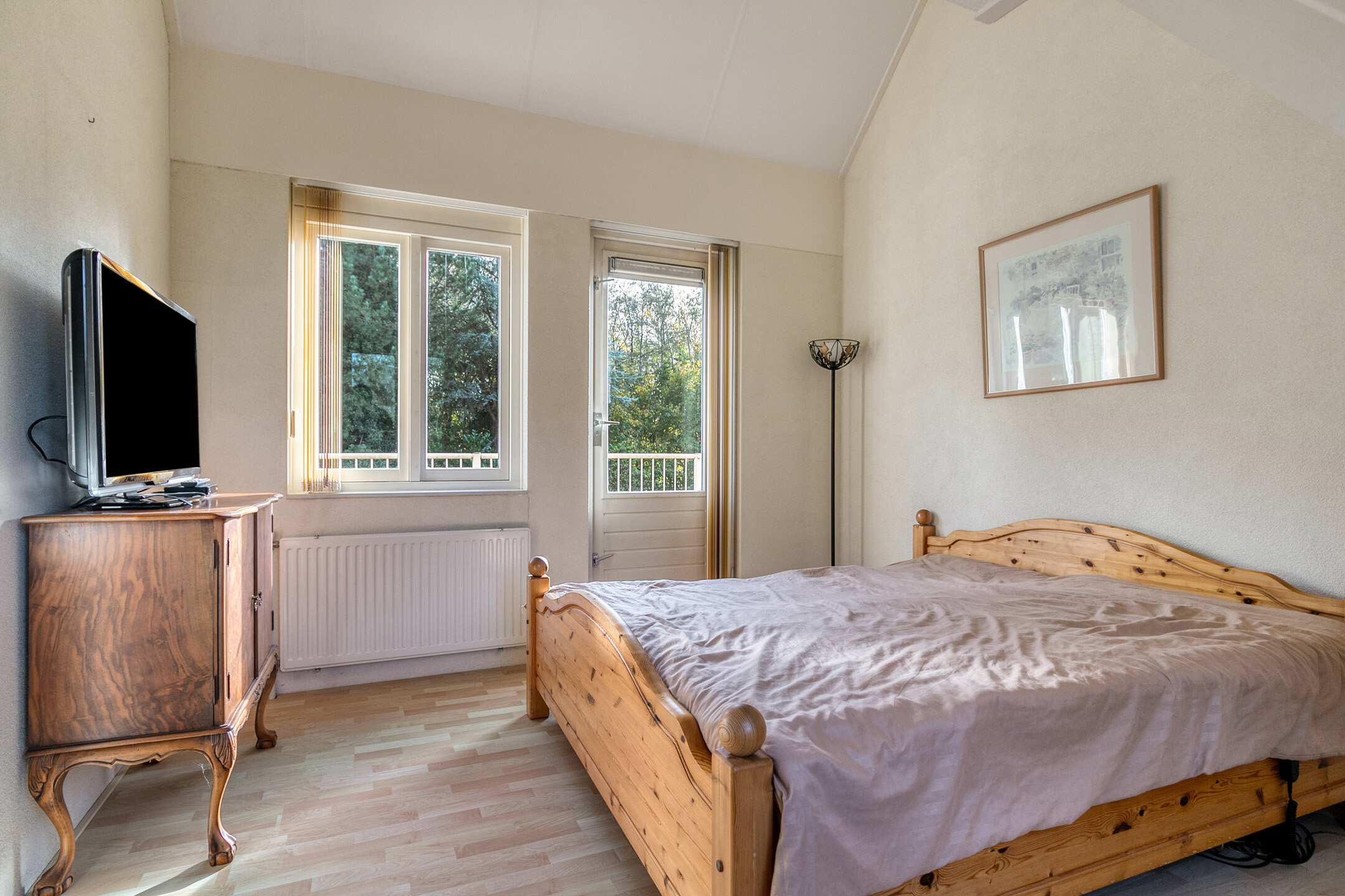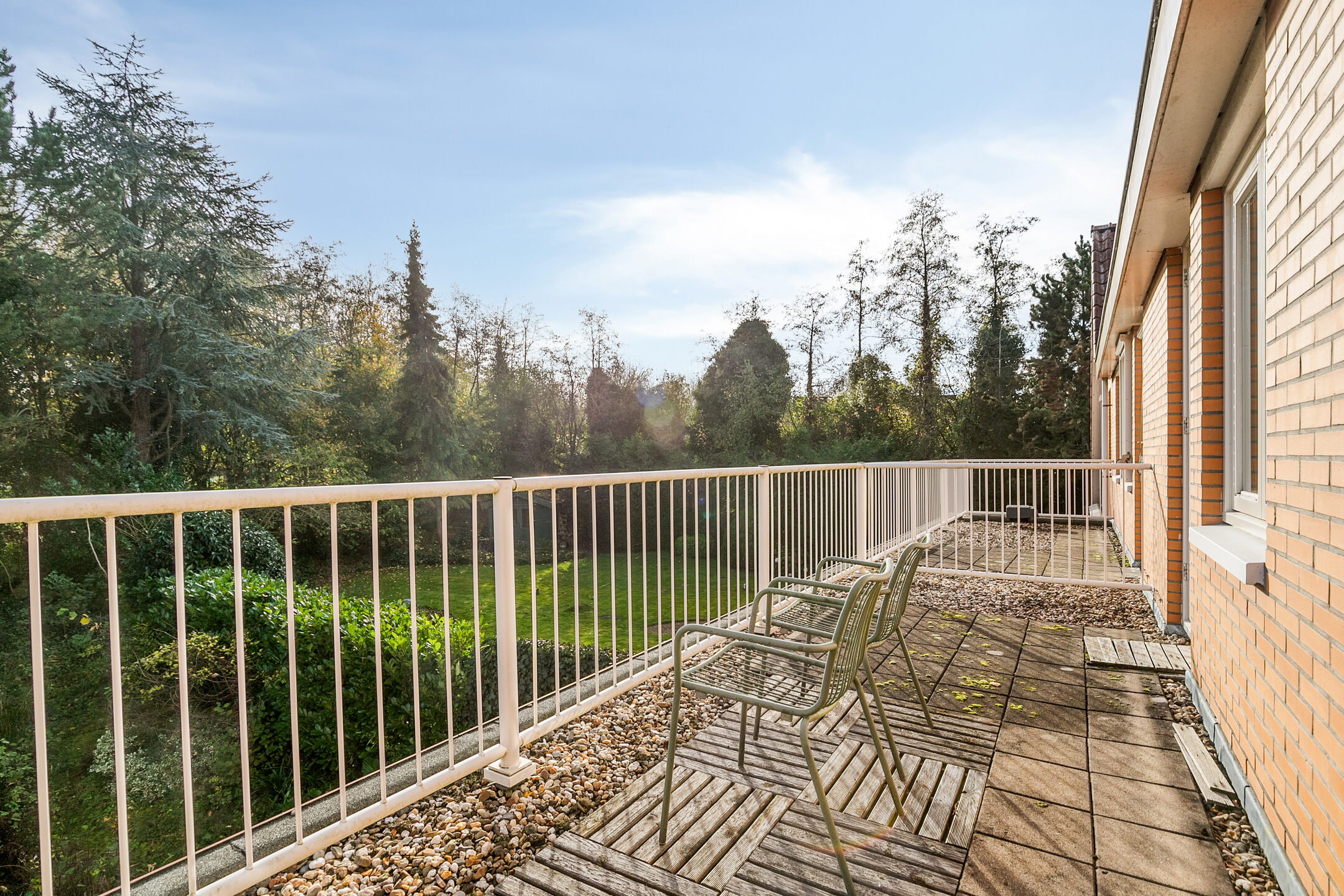 Via een tussendeur bereikt u de ruime masterbedroom: een privéverblijf op zichzelf. Deze kamer beschikt over een eigen badkamer ensuite met ligbad en wastafel, én een heerlijk dakterras op het zuidoosten. Hier geniet u ’s ochtends van de zon, het uitzicht over de tuin en het rustige groen rondom het huis.