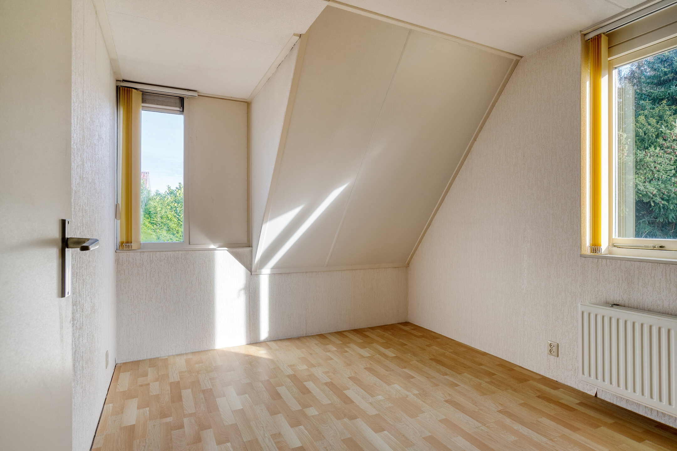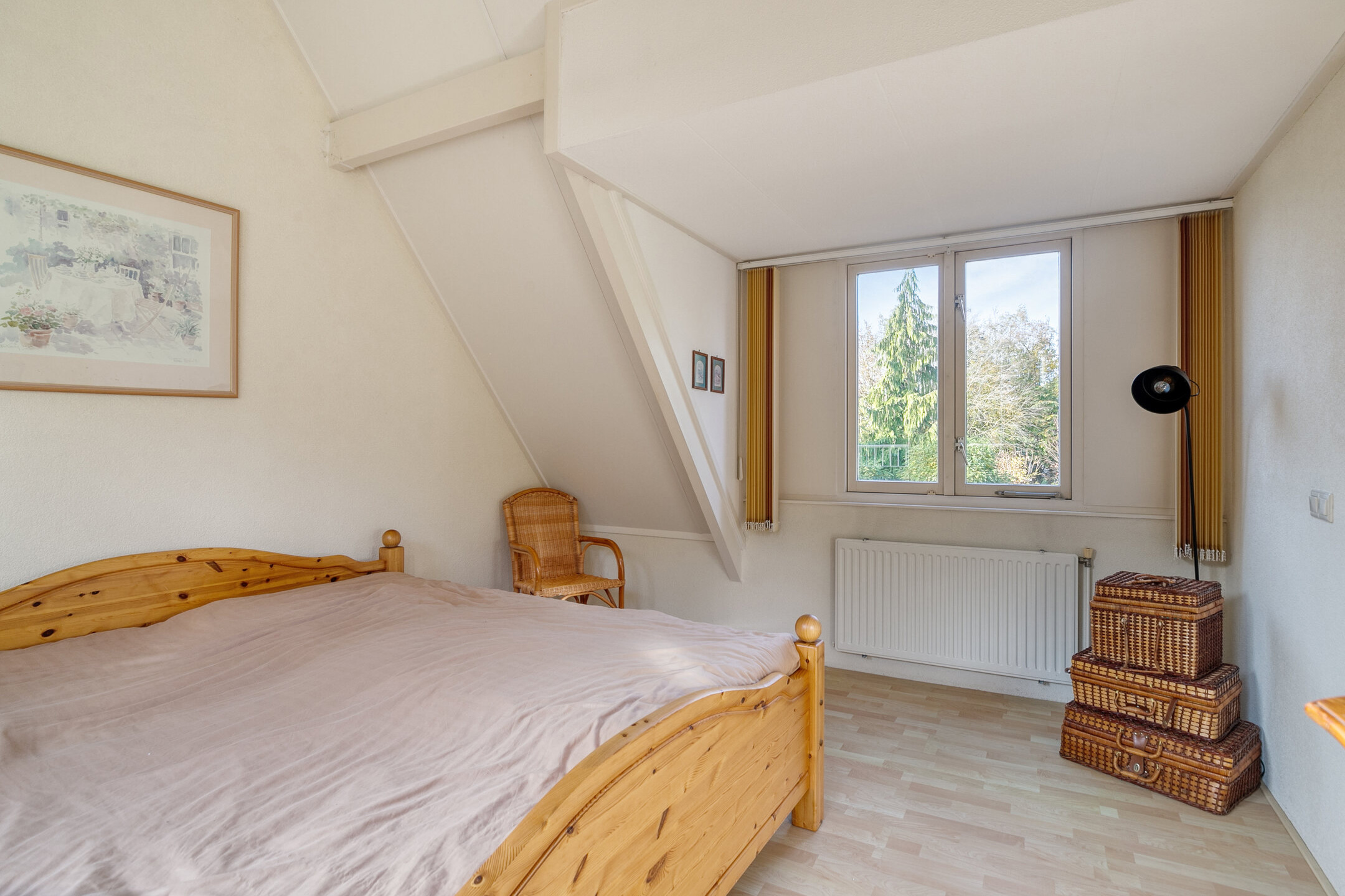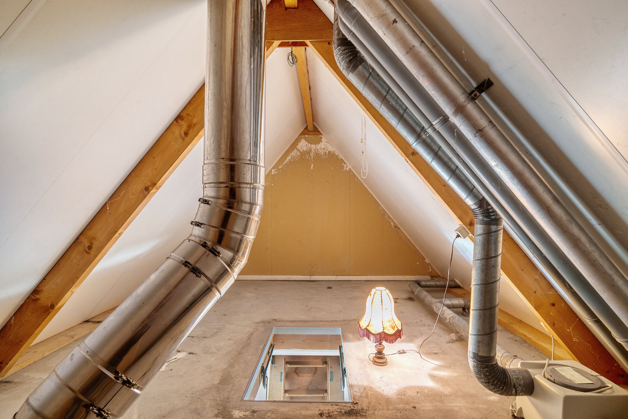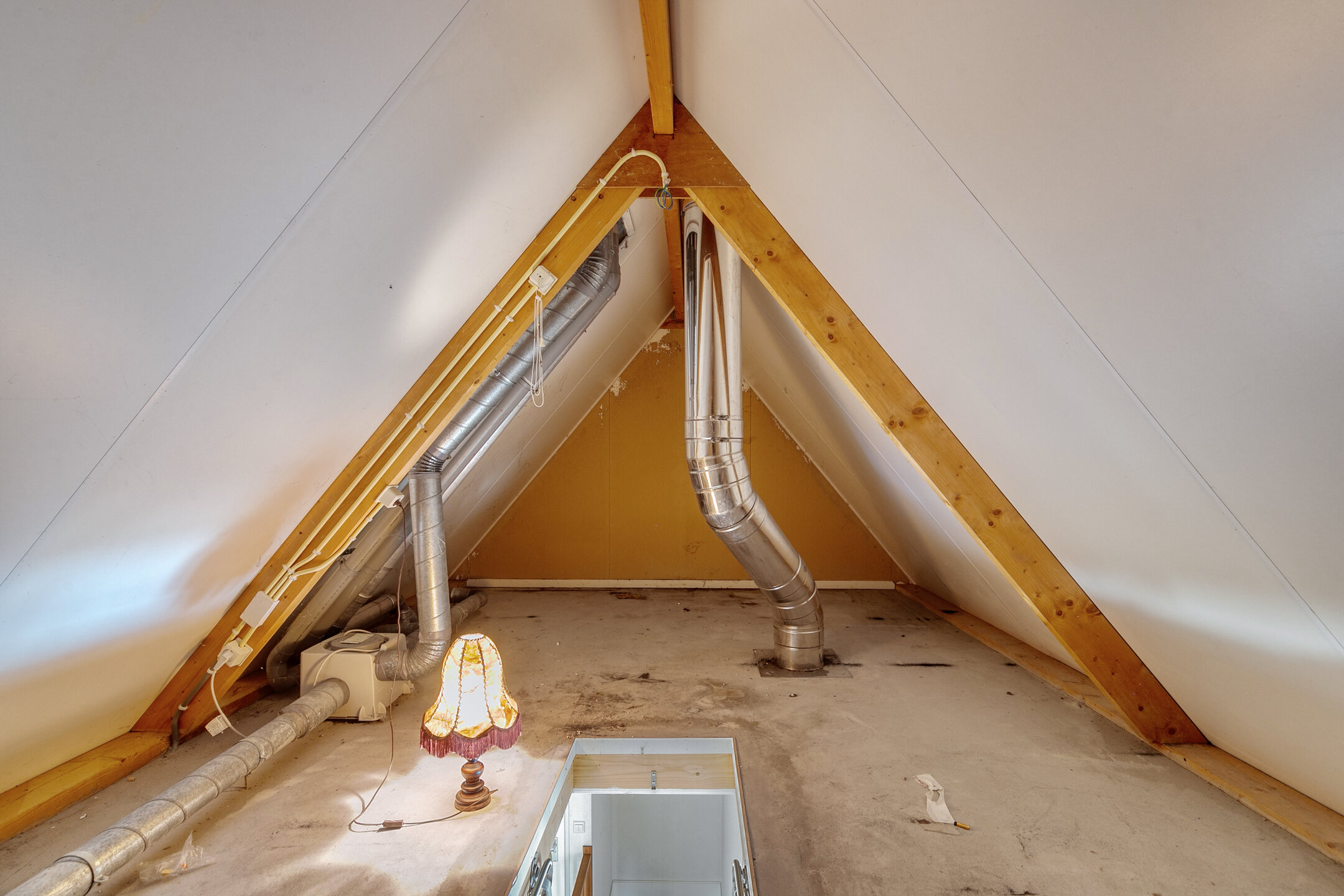 Vanaf de overloop is tevens de vliering bereikbaar: verrassend ruim, met stahoogte en volop opbergmogelijkheden. Hier bevinden zich ook het rookkanaal en de mechanische ventilatiebox.