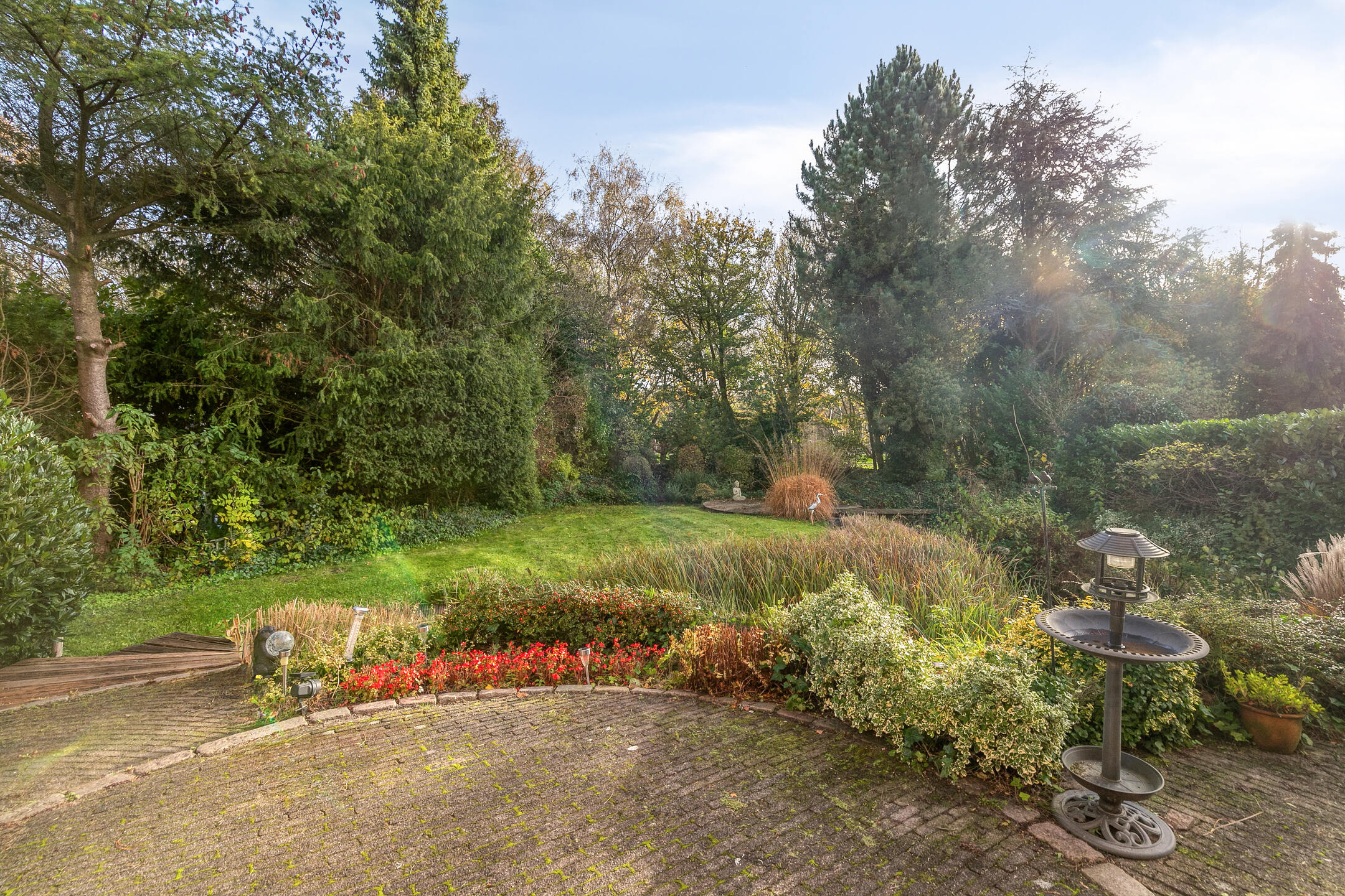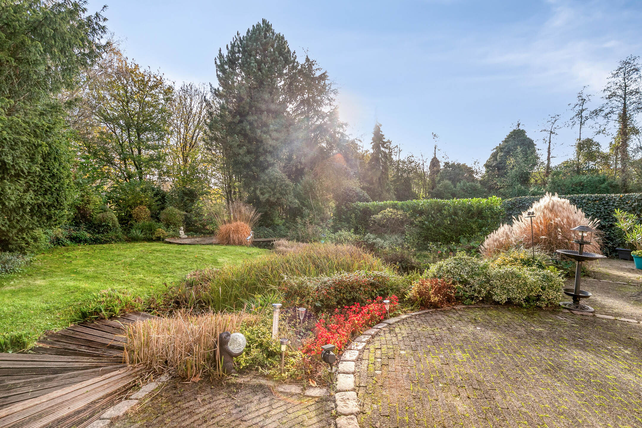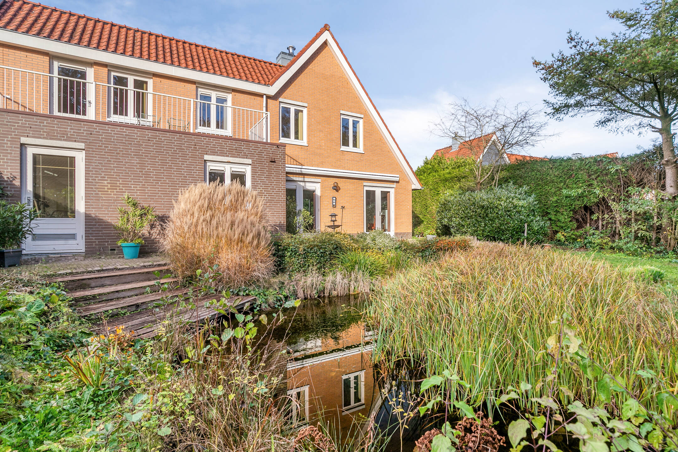 De achtertuin is een klein paradijs voor liefhebbers van groen. Rijk begroeid met bomen, bloemen en planten, voorzien van intieme zitplekjes en een vijver, voelt deze tuin als een privé-oase waar u het hele jaar door kunt genieten van buitenleven, vogels en rust. Dankzij de zij-om is de tuin tevens heel praktisch bereikbaar. De zonnige ligging op het zuidoosten maakt dit de ideale plek om van vroege ochtenden tot late avonden van de zon te genieten.