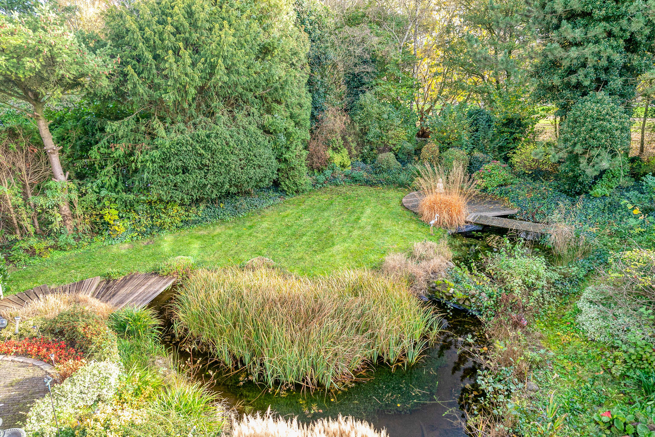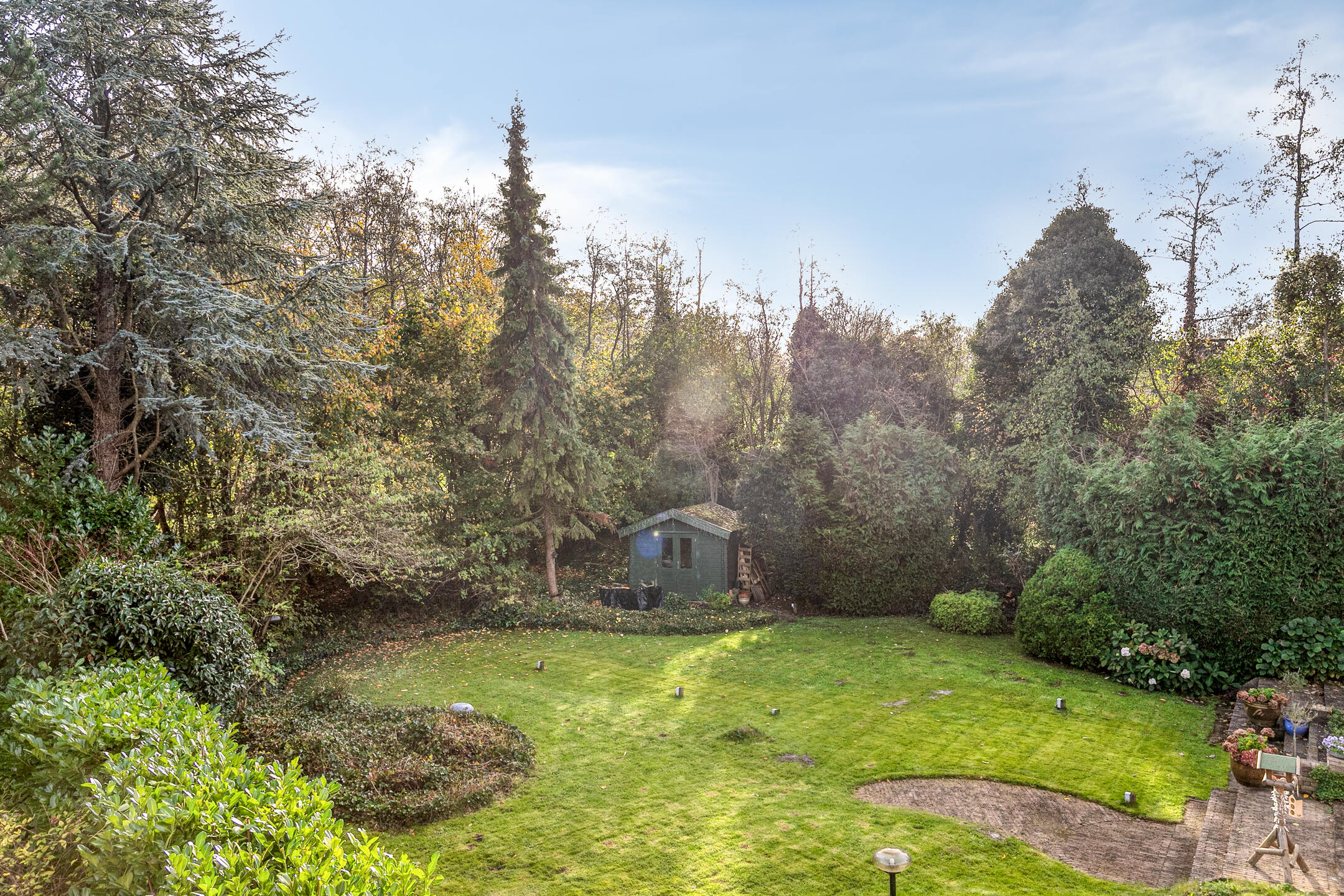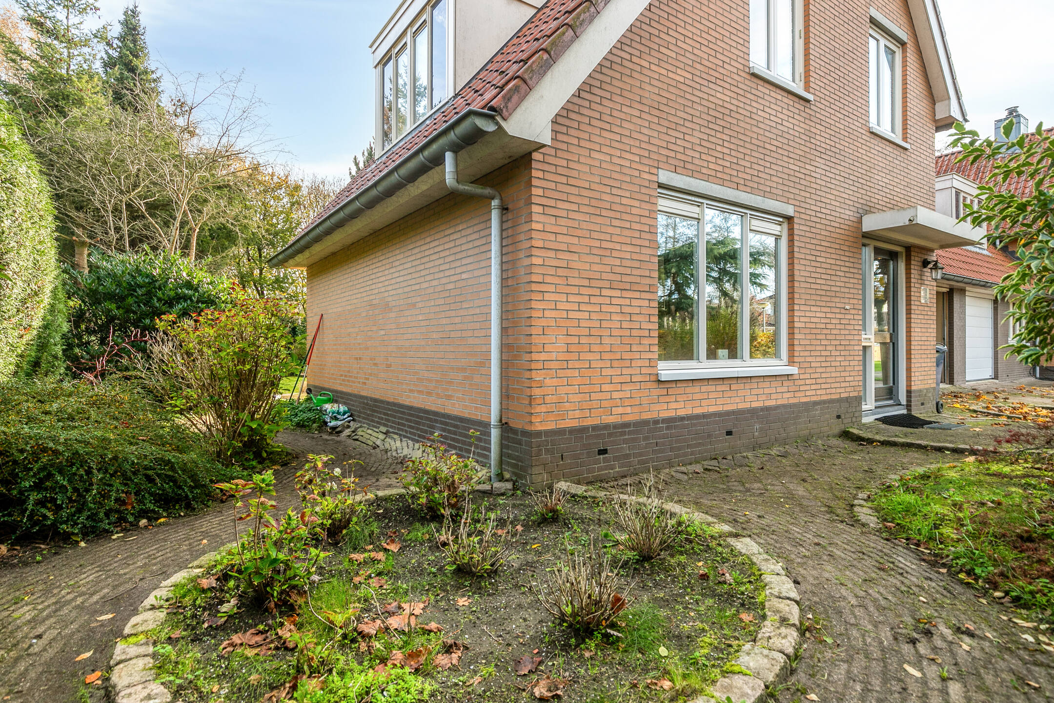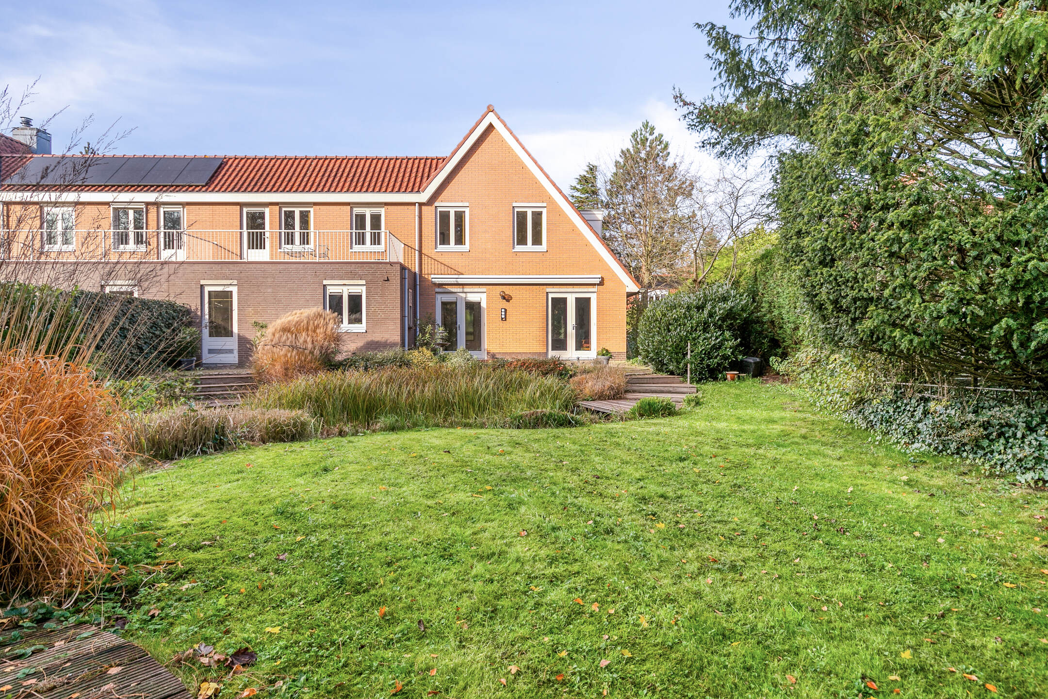 De achtertuin is een klein paradijs voor liefhebbers van groen. Rijk begroeid met bomen, bloemen en planten, voorzien van intieme zitplekjes en een vijver, voelt deze tuin als een privé-oase waar u het hele jaar door kunt genieten van buitenleven, vogels en rust. Dankzij de zij-om is de tuin tevens heel praktisch bereikbaar. De zonnige ligging op het zuidoosten maakt dit de ideale plek om van vroege ochtenden tot late avonden van de zon te genieten.