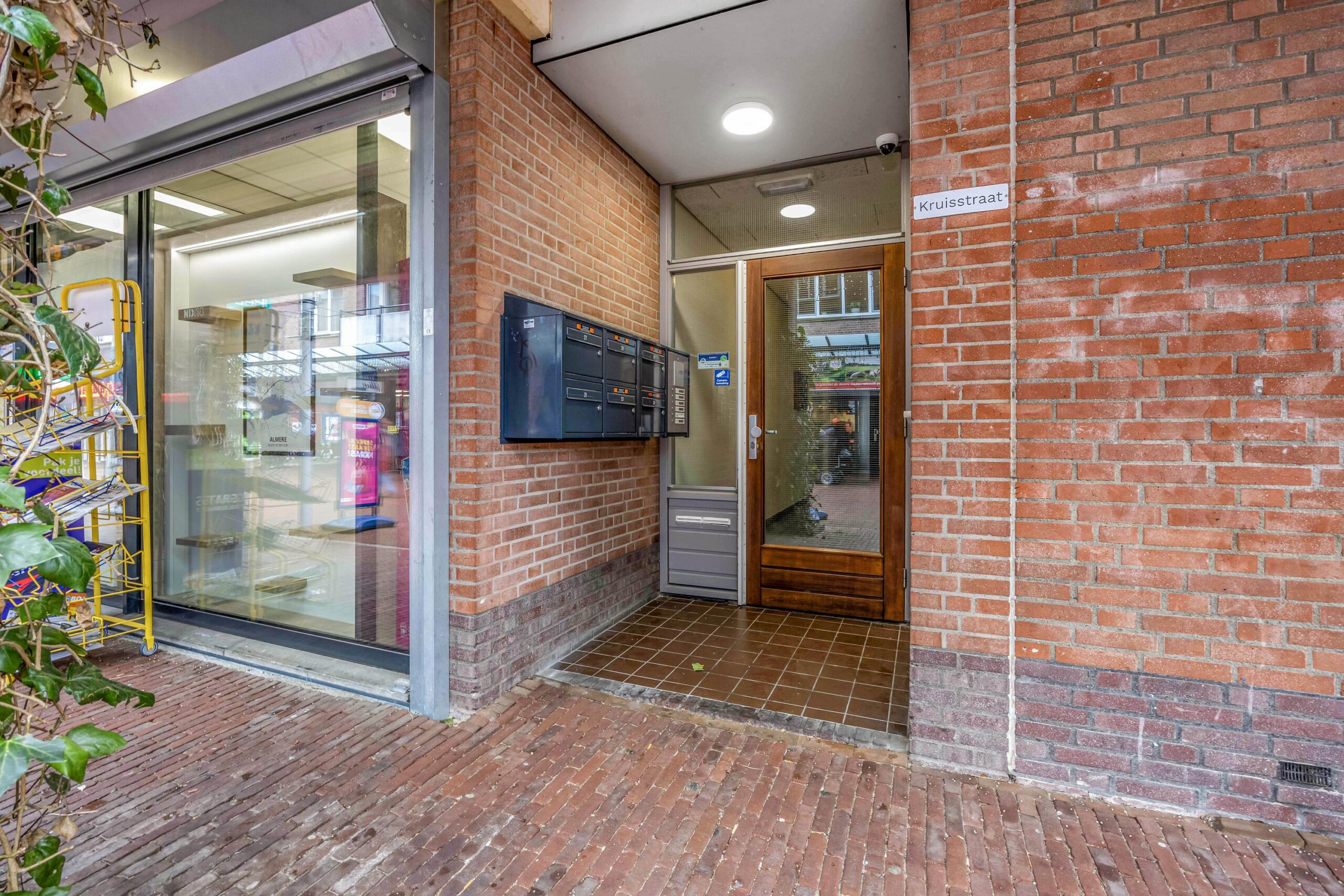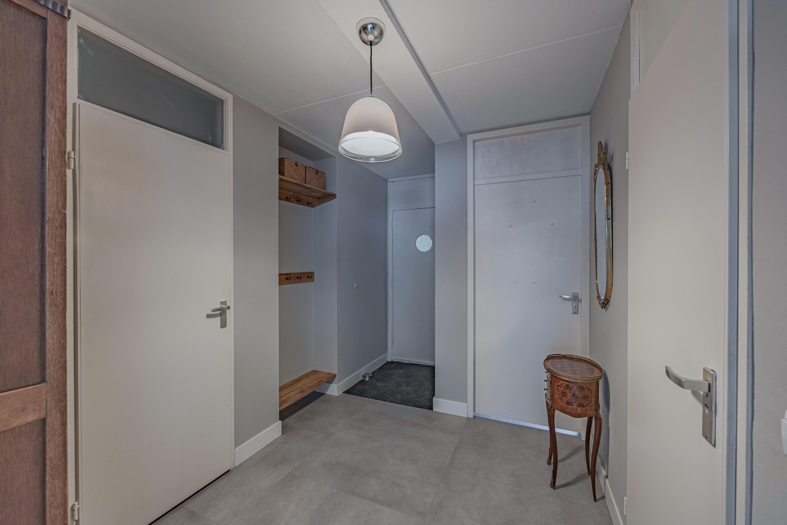 Centrale entree met bellenbord, brievenbussen, trapopgang en toegang tot de bergingen. De woning ligt op de eerste verdieping. Via het voorportaal bereik je de woning.