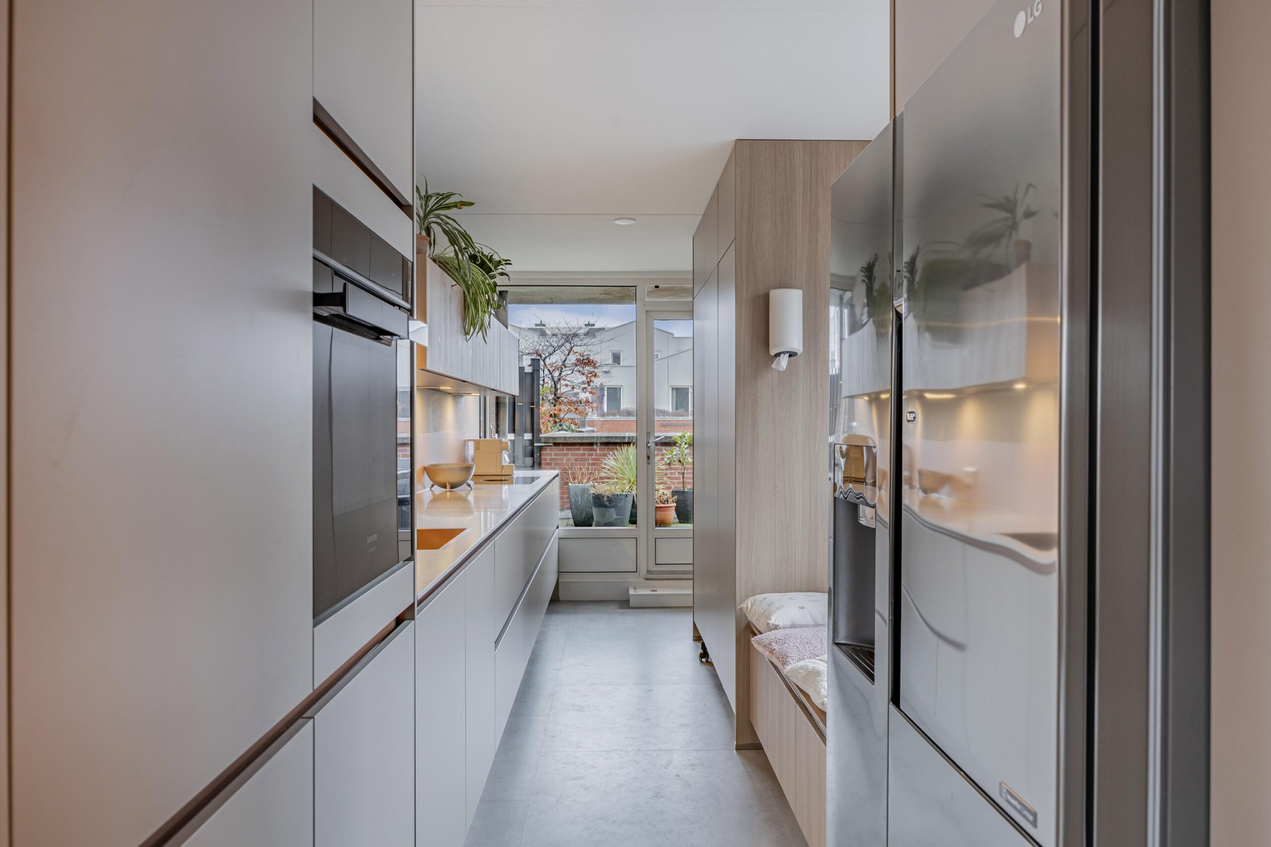 De keuken is zonder twijfel het pronkstuk van de woning. Deze luxe keuken uit 2025 is uitgevoerd in twee rechte opstellingen met taupekleurige kasten en een prachtig natuurstenen werkblad. Hoogwaardige apparatuur zoals een BORA kookplaat met geïntegreerde afzuiging, Siemens Studioline oven en vaatwasser, een strakke koperkleurige spoelbak met een Quooker (3-in-1 flexkraan) en zeedispenser en een LG koelkast met water- en ijsdispenser maken koken hier een beleving. Uniek is de op maat gemaakte zitbank tussen de kasten, met extra bergruimte eronder – een heerlijke plek om te lezen, te borrelen of simpelweg te genieten van het uitzicht. Daarnaast is er een slim weggewerkte thuiswerkplek achter kastdeuren: werken en wonen vloeien hier moeiteloos samen.