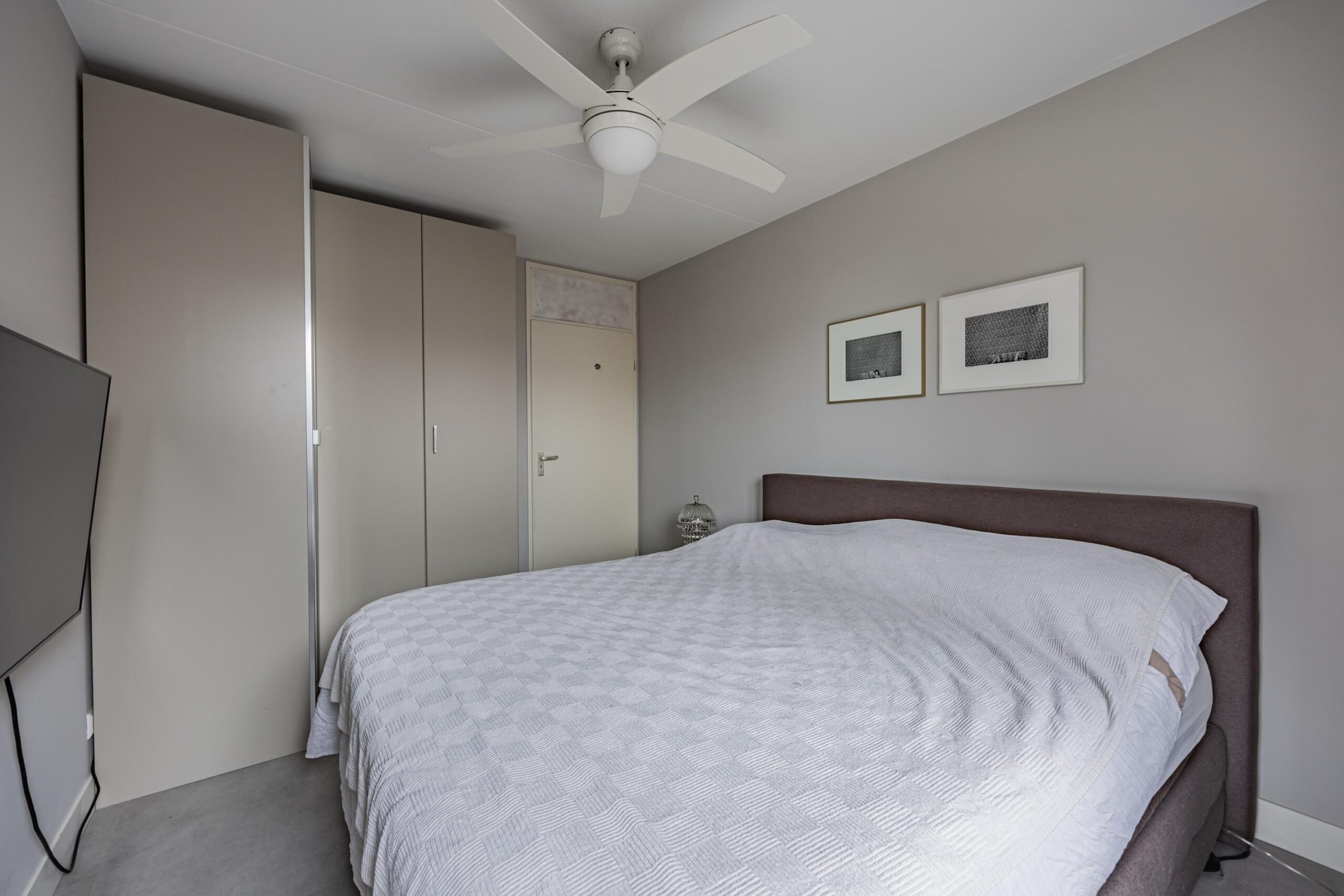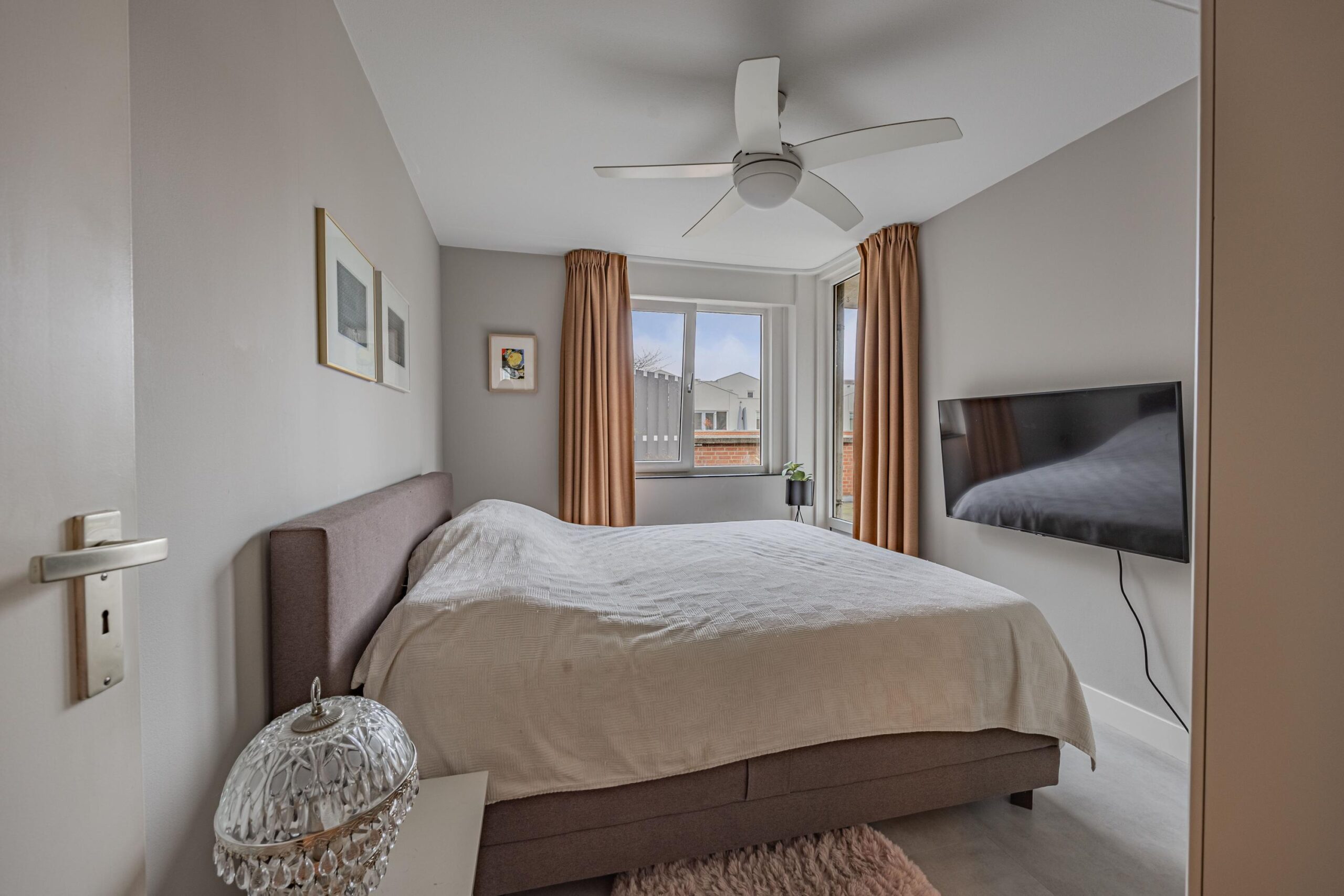 De hoofdslaapkamer bevindt zich aan de achterzijde en kijkt uit op het dakterras. Een rustige, comfortabele ruimte die keurig is afgewerkt. Het gehele appartement is voorzien van op maat gemaakte, elektrisch bedienbare raambekleding (ter overname).