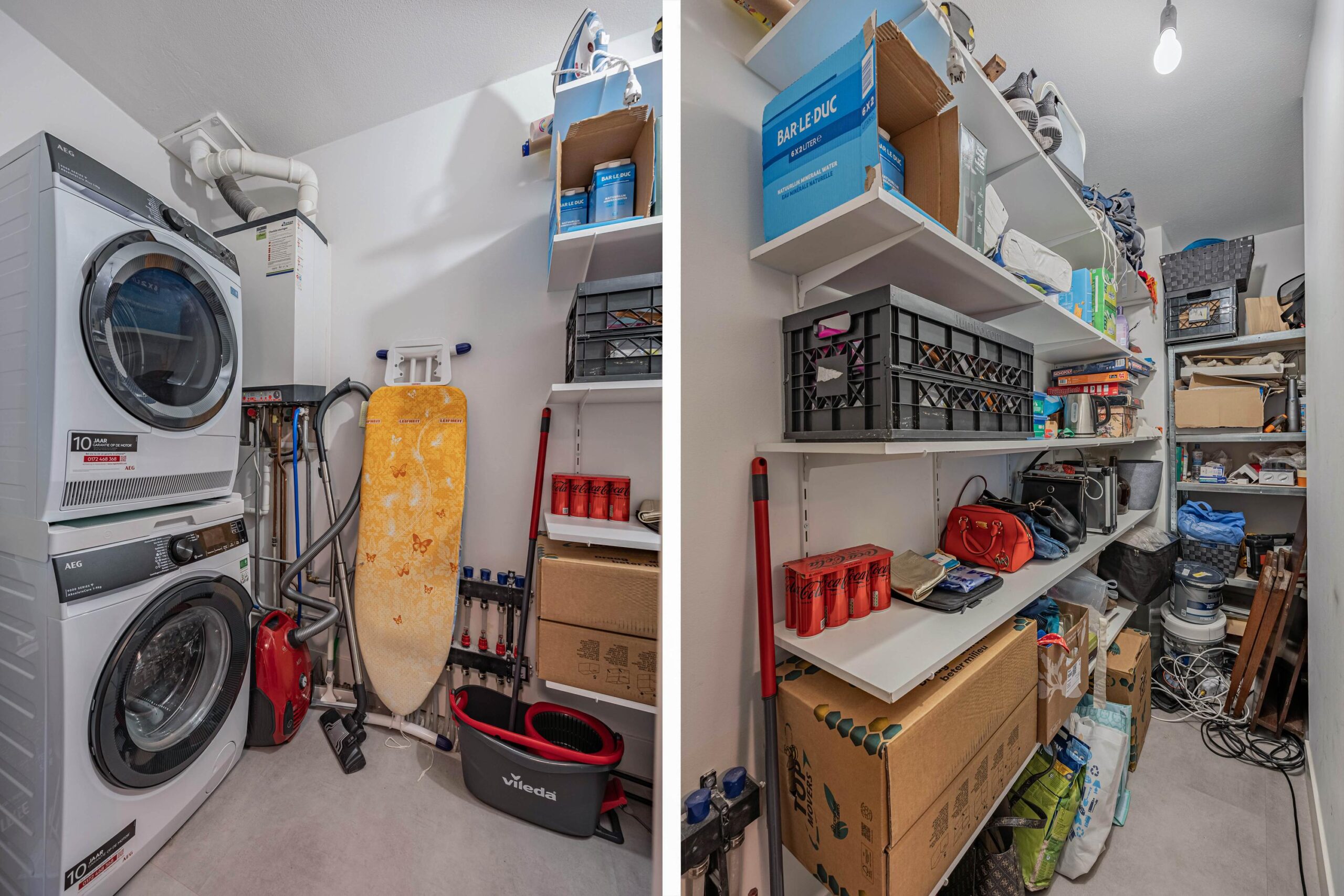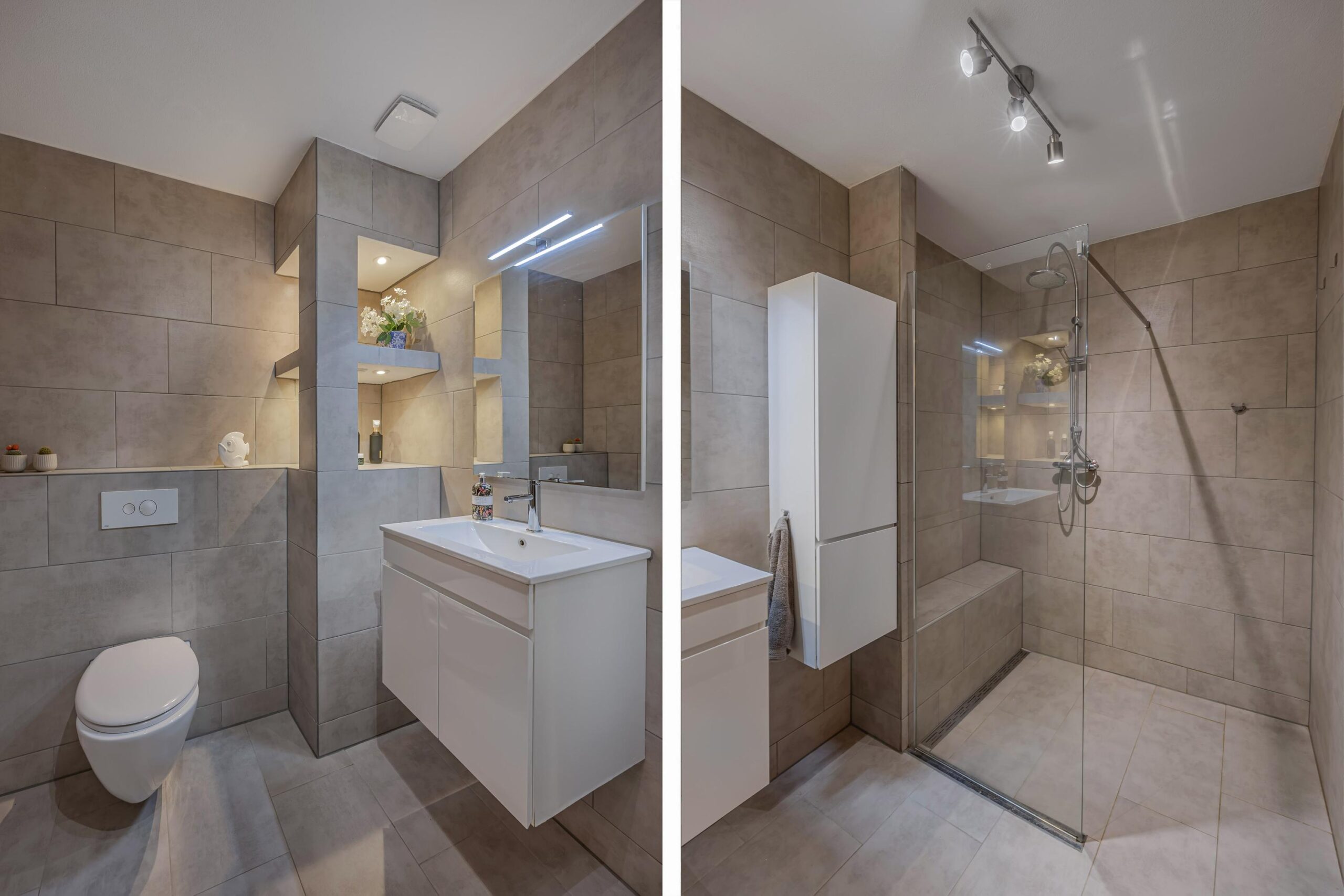 Aan de rechterzijde bevindt zich een uitzonderlijk ruime inpandige berging met aansluitingen voor wasmachine, CV-ketel en de verdeler van de vloerverwarming. Praktisch ingericht met vaste schappen – ideaal voor wie houdt van orde en overzicht. Aan de linkerzijde ligt de moderne badkamer, volledig tot aan het plafond betegeld. Een fijne plek om de dag te beginnen of juist af te sluiten, met een comfortabele inloopdouche met regen- en handdouche, een zitbankje, toilet, wastafelmeubel en een strak nisje voor je verzorgingsproducten.