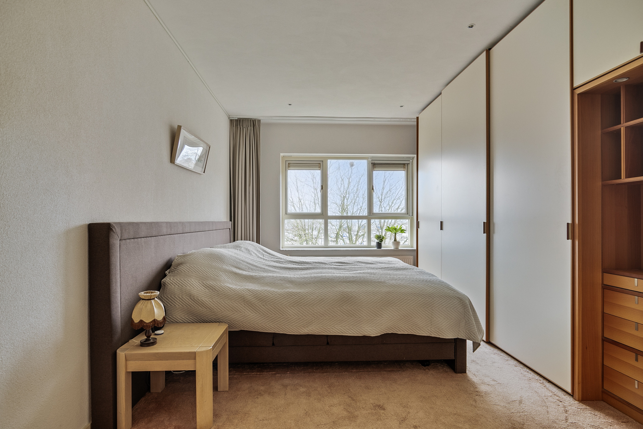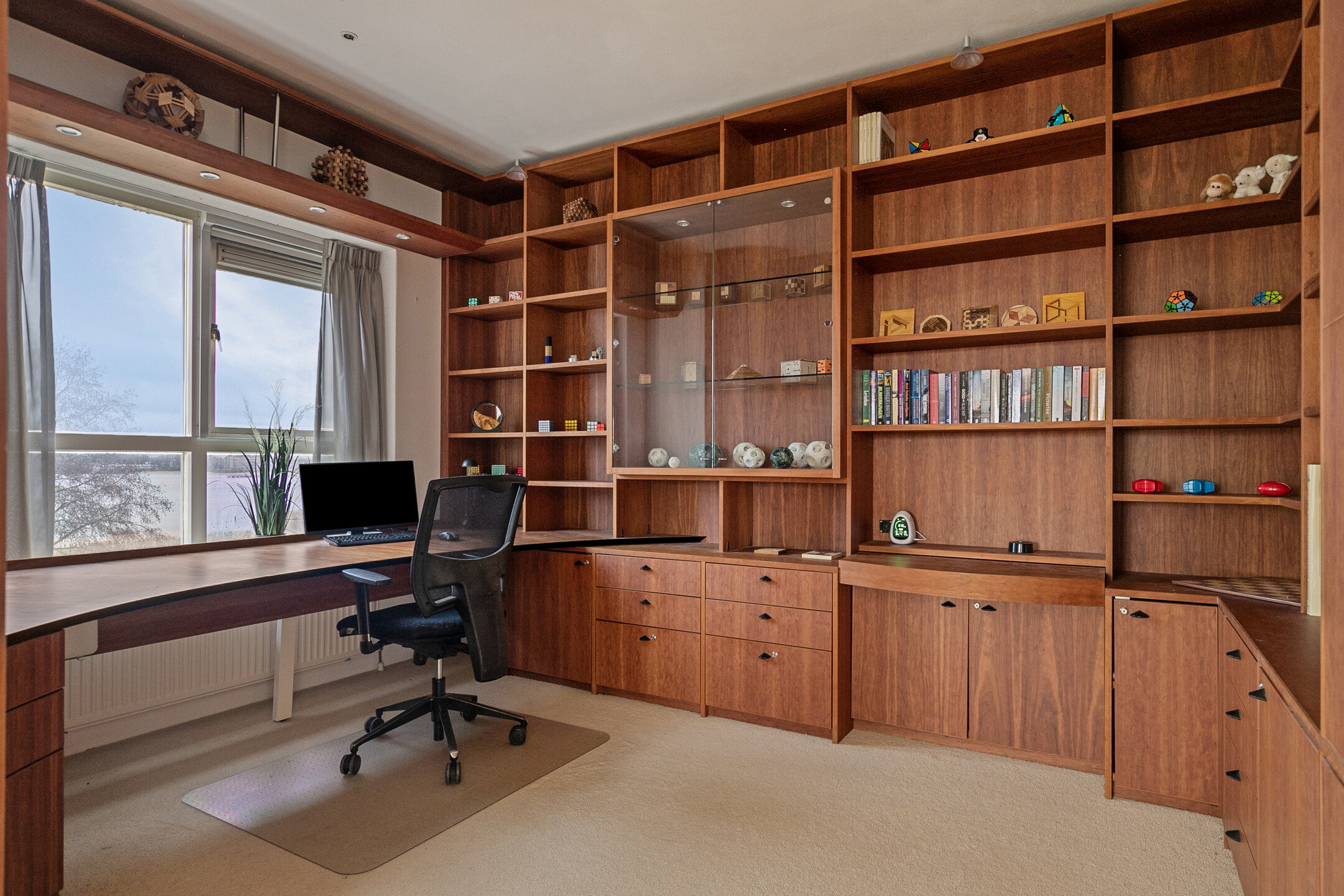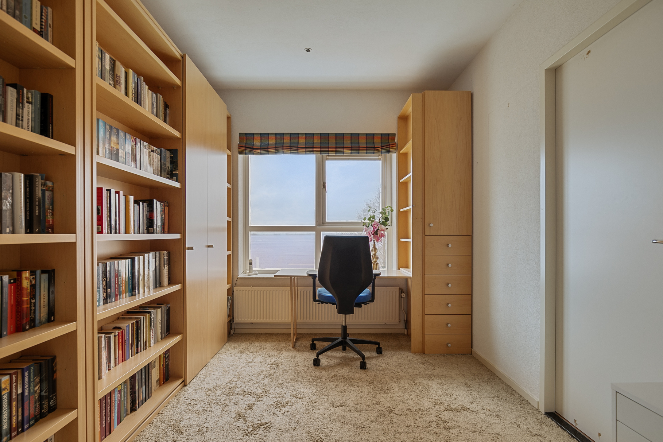Vanuit de woonkamer bereikt u de werkkamer. Er is een grote vaste kasten wand geplaatst en een mooie werkruimte gecreëerd. Deze kamer is ook ideaal te gebruiken als slaapkamer.