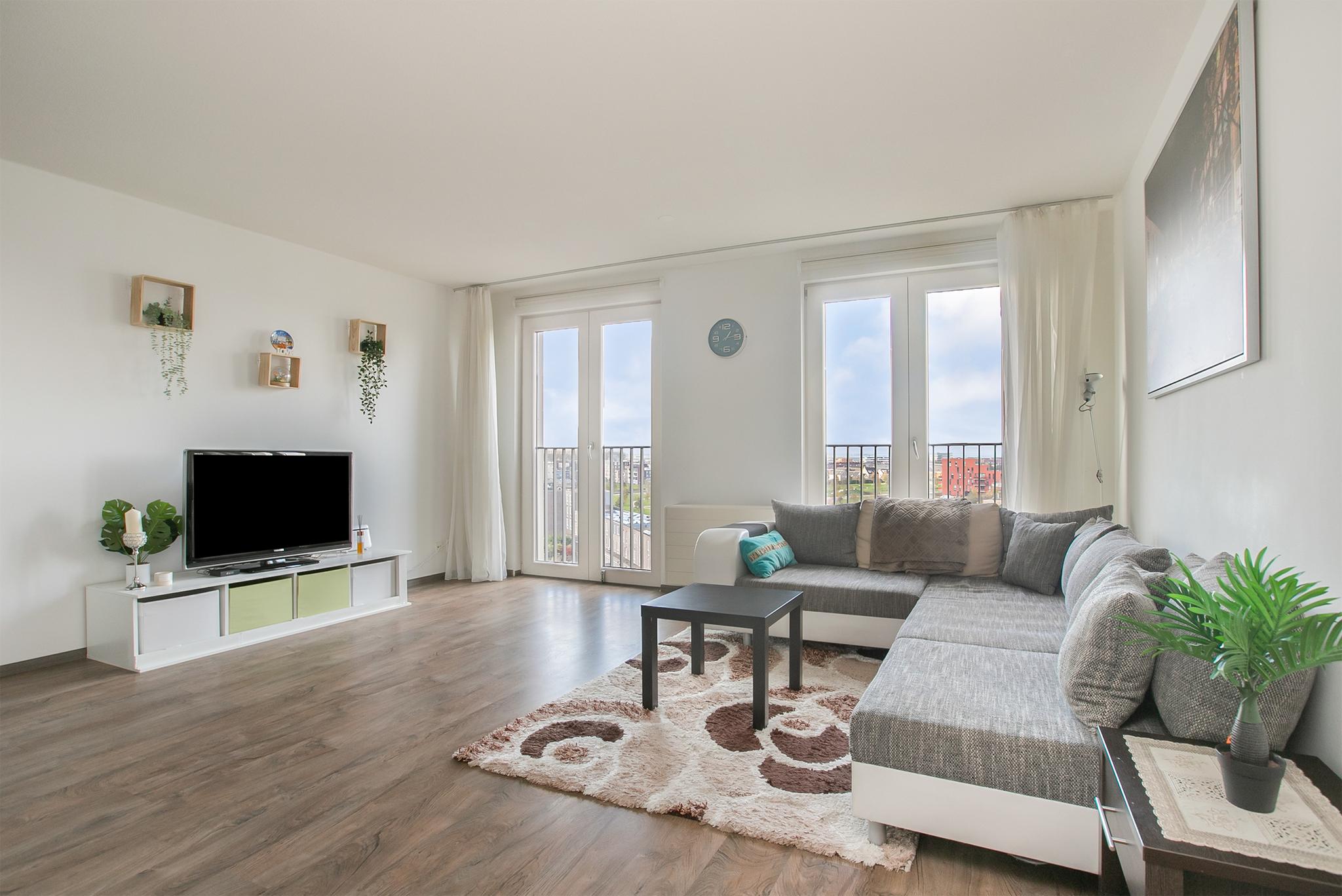 Via de centrale hal met bellentableau komt u het complex met lift en trapopgang binnen. De woning bereikt u via de galerij op de zevende verdieping. U komt de woning binnen in de gang met plek voor de garderobe, de meterkast met glasvezelaansluiting en kast met de stadsverwarming. Vanuit de hal bereikt u de diverse ruimtes in de woning. Als u direct doorloopt naar het einde komt u uit in de woonkamer. De woonkamer is gelegen over de gehele breedte van het appartement en beschikt over een moderne open keuken. De woonkamer heeft een ruime zitplek en een mooie plek voor het plaatsen van een eettafel aan de raamzijde. De keuken is in een rechtsopstelling met onder- en bovenkastruimte en is voorzien van diverse inbouwapparatuur waaronder; een vaatwasser, een oven, een inductiekookplaat (2020) met daarboven een afzuigkap, een koelkast (2020) en vriezer. Vanuit de woonkamer heeft u een schitterend uitzicht middels de 2 franse balkons.
