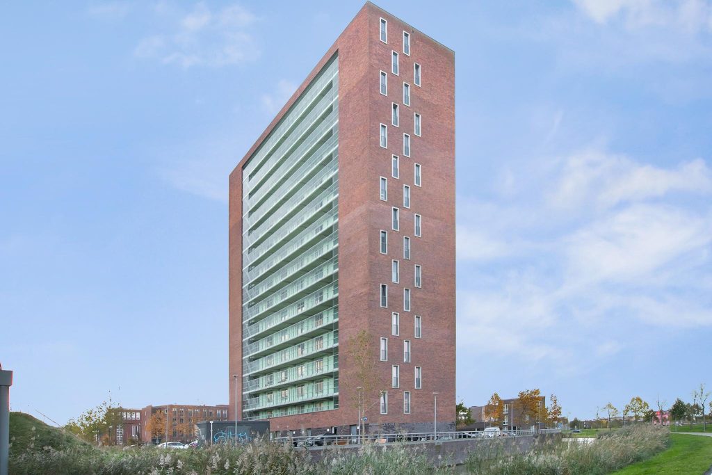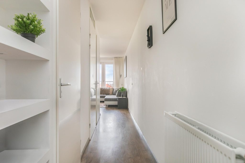 Via de centrale hal met bellentableau komt u het complex met lift en trapopgang binnen. De woning bereikt u via de galerij op de zevende verdieping. U komt de woning binnen in de gang met plek voor de garderobe, de meterkast met glasvezelaansluiting en kast met de stadsverwarming. Vanuit de hal bereikt u de diverse ruimtes in de woning. Als u direct doorloopt naar het einde komt u uit in de woonkamer. De woonkamer is gelegen over de gehele breedte van het appartement en beschikt over een moderne open keuken. De woonkamer heeft een ruime zitplek en een mooie plek voor het plaatsen van een eettafel aan de raamzijde. De keuken is in een rechtsopstelling met onder- en bovenkastruimte en is voorzien van diverse inbouwapparatuur waaronder; een vaatwasser, een oven, een inductiekookplaat (2020) met daarboven een afzuigkap, een koelkast (2020) en vriezer. Vanuit de woonkamer heeft u een schitterend uitzicht middels de 2 franse balkons.