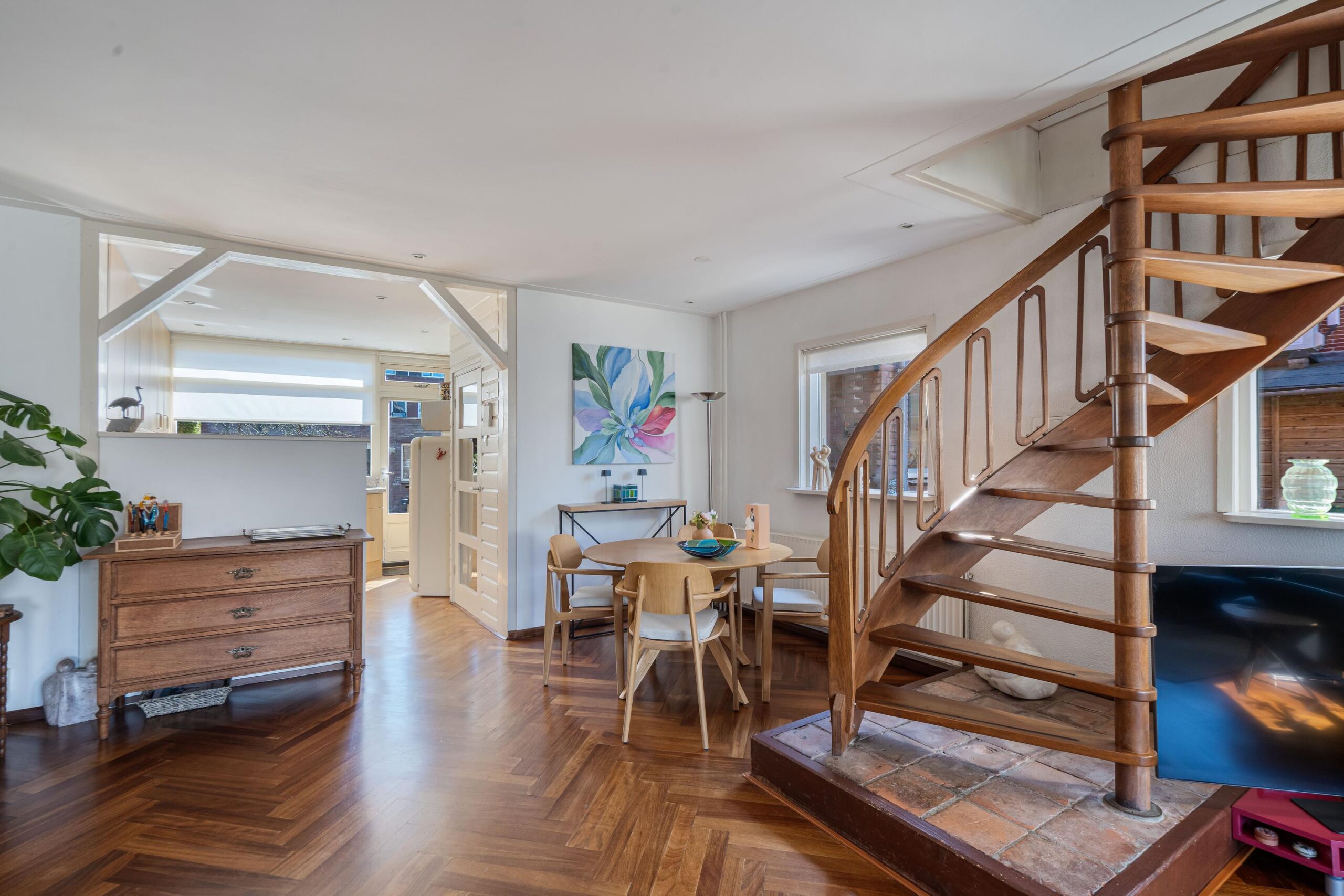 Via de wenteltrap in de woonkamer bereikt u de eerste verdieping. Deze verdieping was oorspronkelijk ingedeeld met drie slaapkamers, maar is momenteel ingericht als één royale slaapkamer.